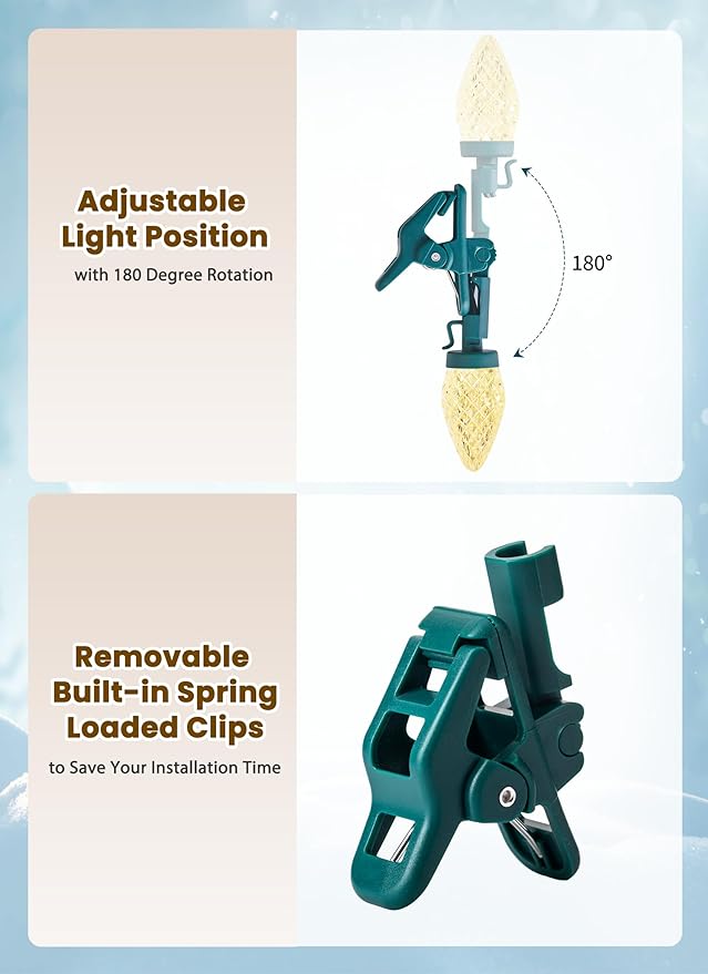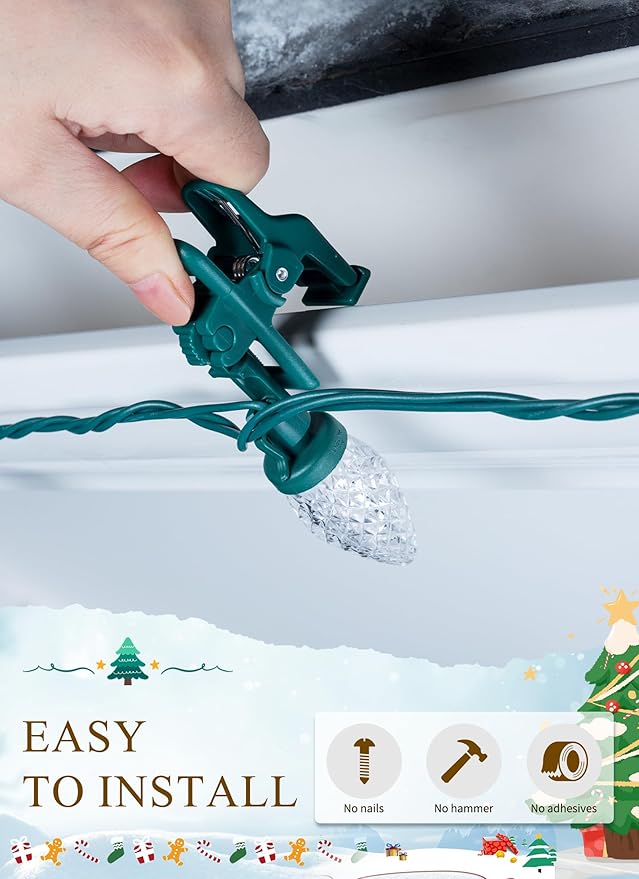 - Convenient Firm Setup and Removeable Quick Clips: These energy efficient C9 LED Christmas lights come with spring-loaded clips for quick installation, offering the option of fastening safely in a wider variety of settings (clips can also be removed if deemed unnecessary). Compared with ordinary clips, the spring-loaded clips can more firmly and securely clamp objects such as the roof, railing or tree. Very suitable for outdoor and indoor use