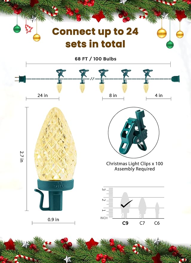 - Convenient Firm Setup and Removeable Quick Clips: These energy efficient C9 LED Christmas lights come with spring-loaded clips for quick installation, offering the option of fastening safely in a wider variety of settings (clips can also be removed if deemed unnecessary). Compared with ordinary clips, the spring-loaded clips can more firmly and securely clamp objects such as the roof, railing or tree. Very suitable for outdoor use