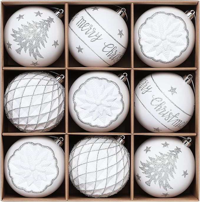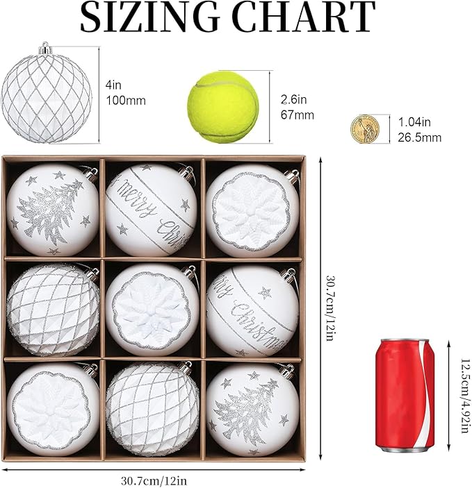 - šćLarge SizećThese large White ornaments balls are 10cm/4". Pack of 9 Balls.Tree balls with light weight and won't weigh down your Christmas tree branches.