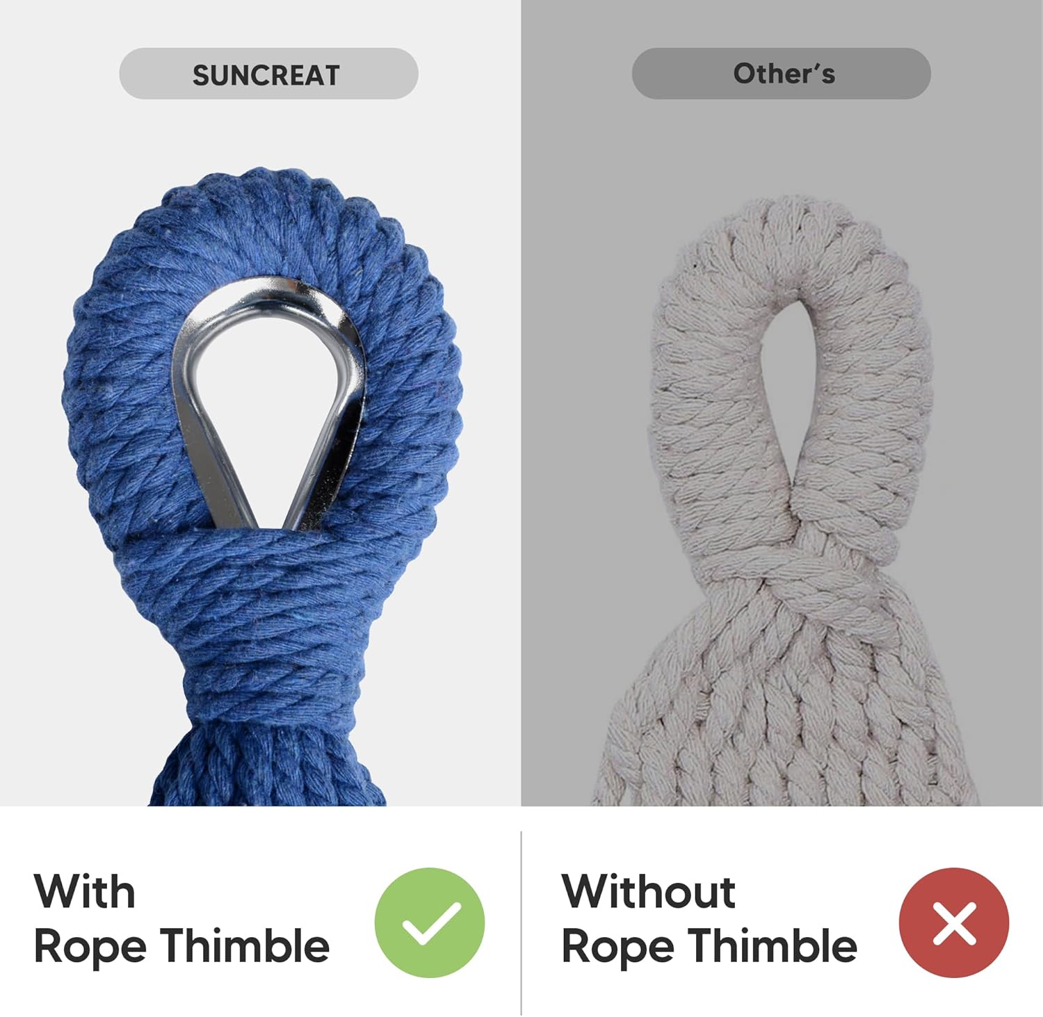 - Handcrafted Ropes: The metal rope thimble is effective for preventing the long-term friction between the tree strap and the ropes, thus prolong the service life of the hammock. The 18 ropes at both ends of the hammock are made of poly-cotton, tightly braided and fixed, which greatly increase the load bearing capacity