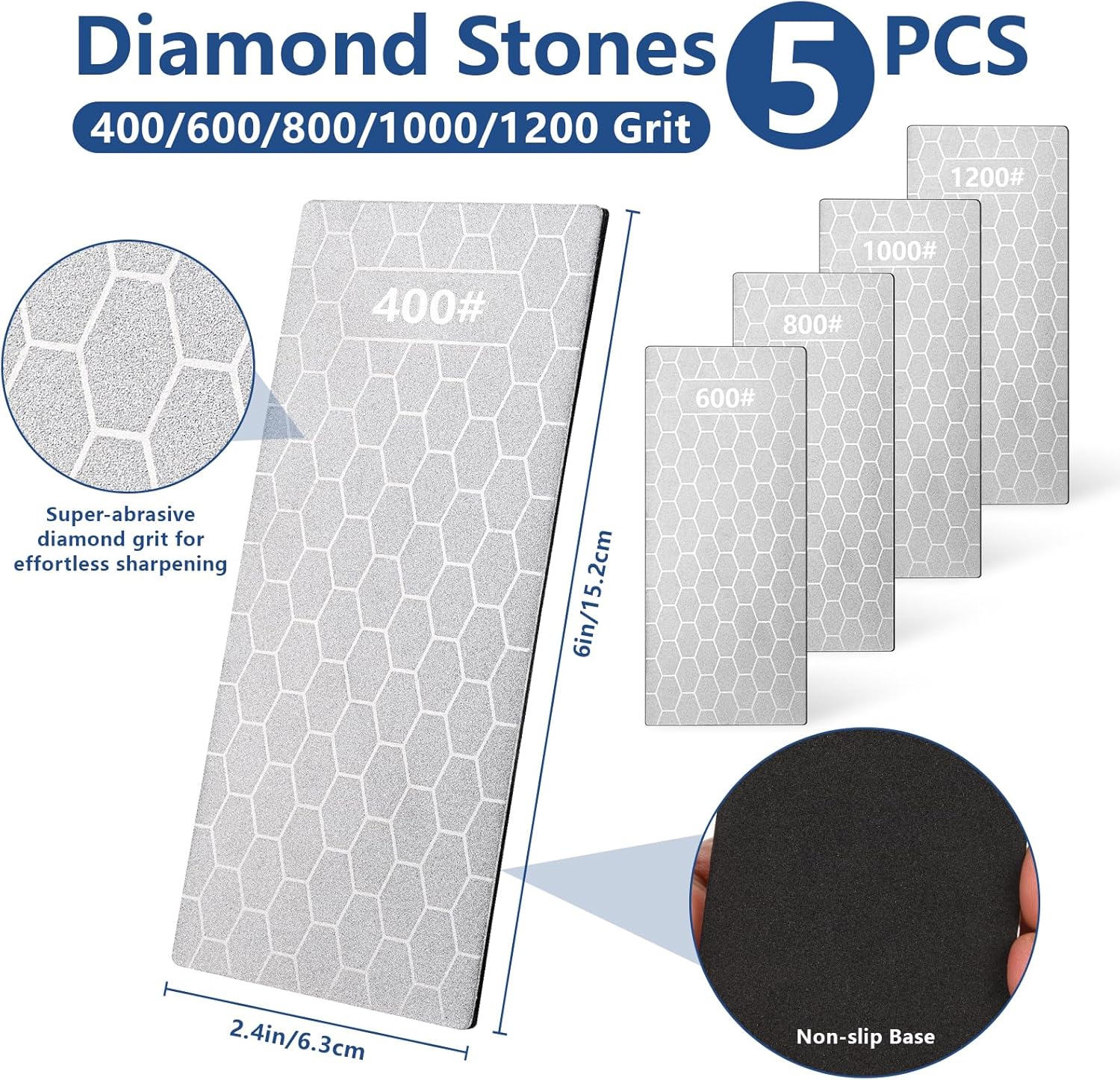 - 【5 Grit Diamond Stones – 400/600/800/1000/1200 grit】Includes five diamond sharpening stones ranging from coarse to ultra-fine—perfect for reshaping, refining, and polishing tool edges. The unique honeycomb surface effectively channels away metal filings to prevent clogging, protect blade edges, and extend stone life. Each stone features a non-slip base for stable, efficient sharpening.