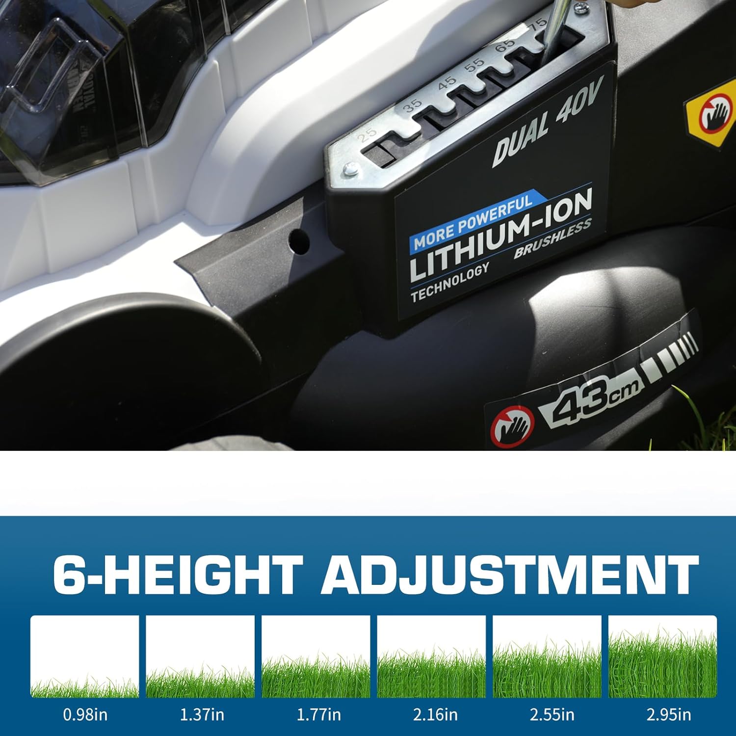- 【6-Position Height Adjustment】:This cordless brushless lawn mower has 6 cutting heights, from 0.98inch to 2.95 inch,making it easy to handle lawns of different heights. Whether it's newly sprouted lawns or overgrown lawns, it can easily handle them, giving you a clean and comfortable backyard lawn
