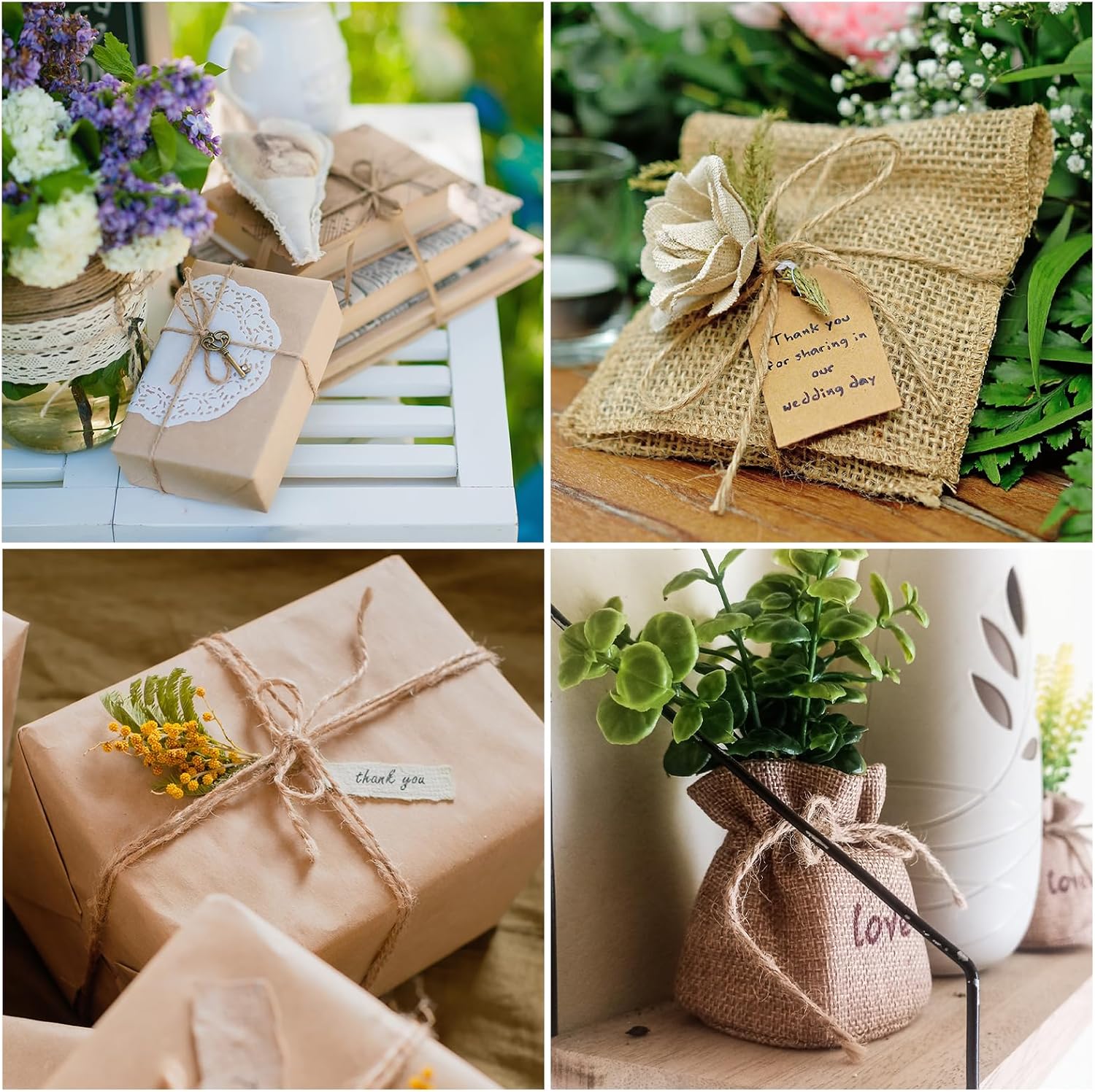 - Wide Application: Jute twine rope is very suitable for decorating a variety of creative objects, such as bottles,photo wall decoration,woven pendant. Also make beautiful gift wrap, gift tag, photo cords, crafts and DIY projects to create handmade rustic decoration.
