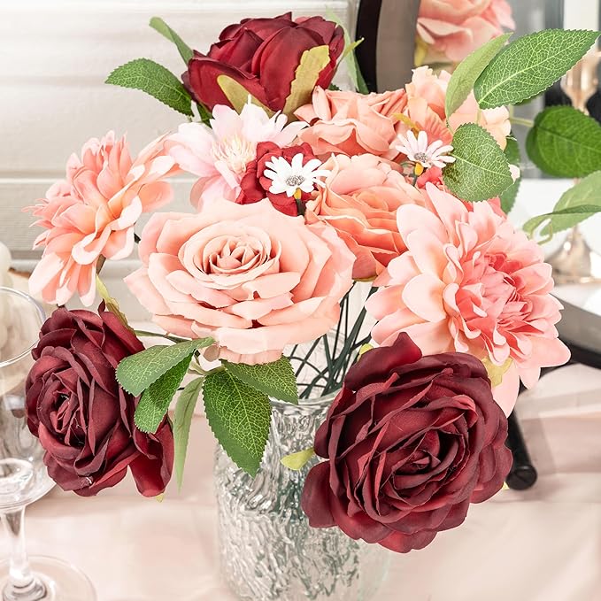 - Red ARTIFICIAL FLOWERS COMBO-A total of 30pcs flowers. Our flower set contains peonies, roses, dahlias, dried hydrangeas and other flowers, green leaves, 35-40 pcs plastic stems, 1pcs raffia and 1pcs hot melt accessories. All comes in a very cute box, easy giftable item.