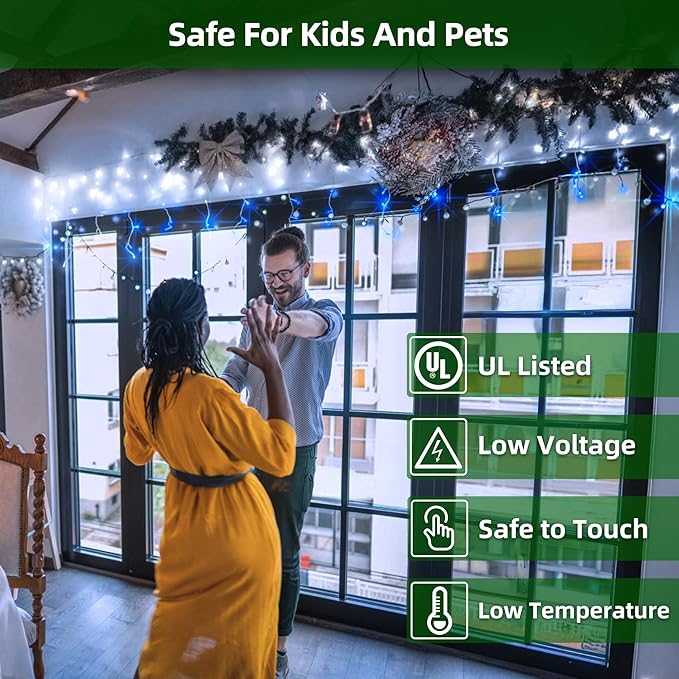 - Transform your home into a winter wonderland: Our 50ft 504 LED icicle lights (112 drops) combine cool white and blue to create a frosty, elegant glow that brightens every corner—perfect for both outdoor roofs, patios, fences, gutters and indoor bedrooms, porches, balconies. The sparkling interplay of cool white and blue mimics winter frost, ideal for family time by the tree, cozy patio dinners, or decorating gazebos and deck railings. Longer than most sets, commercial Christmas display look