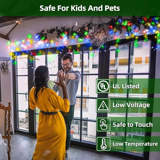 - Safe & energy efficient: Our UL-listed energy efficient Christmas lights use a 29V low-voltage plug, safe for kids and pets even after hours. LEDs consume 90% less power than incandescents and last up to 50,000 hours. Durable insulated wiring and sealed bulbs resist wear and weather, staying cool to the touch— just years of colorful glow. Suitable for both indoor and outdoor use, from Christmas tree lights to patio string lights.