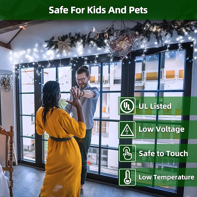 - Transform your home into a holiday haven: Our 50ft 504 LED cool white icicle Christmas lights (112 drops) cover every corner—outdoor (roofs, patios, fences, gutters) to indoor (bedrooms, porches, balconies). The crisp cool white glow feels like winter frost, perfect for family time by the Christmas tree, cozy patio dinners, or sparkling gazebos and deck railings. Longer than most sets, it delivers a commercial Christmas lights look that keeps your holiday moments shining bright