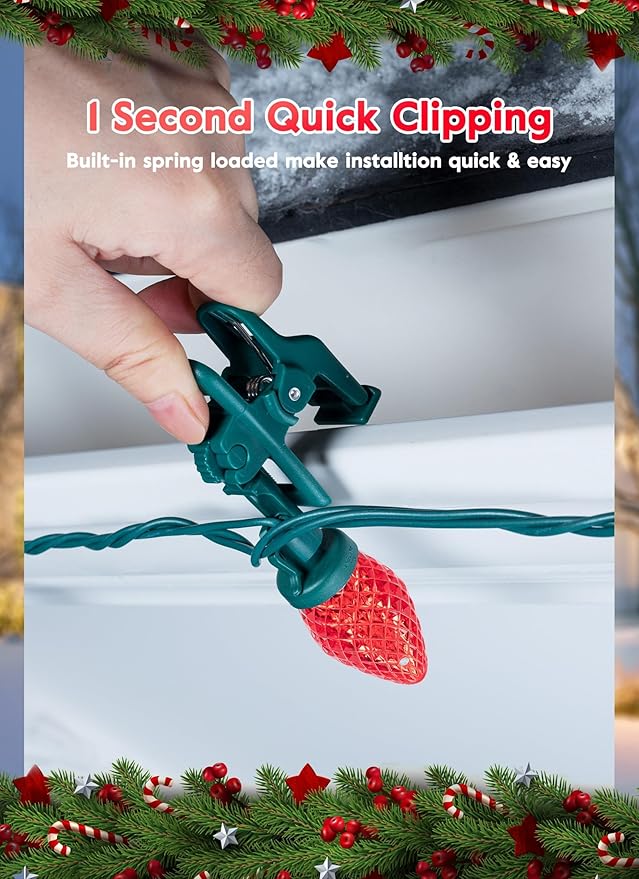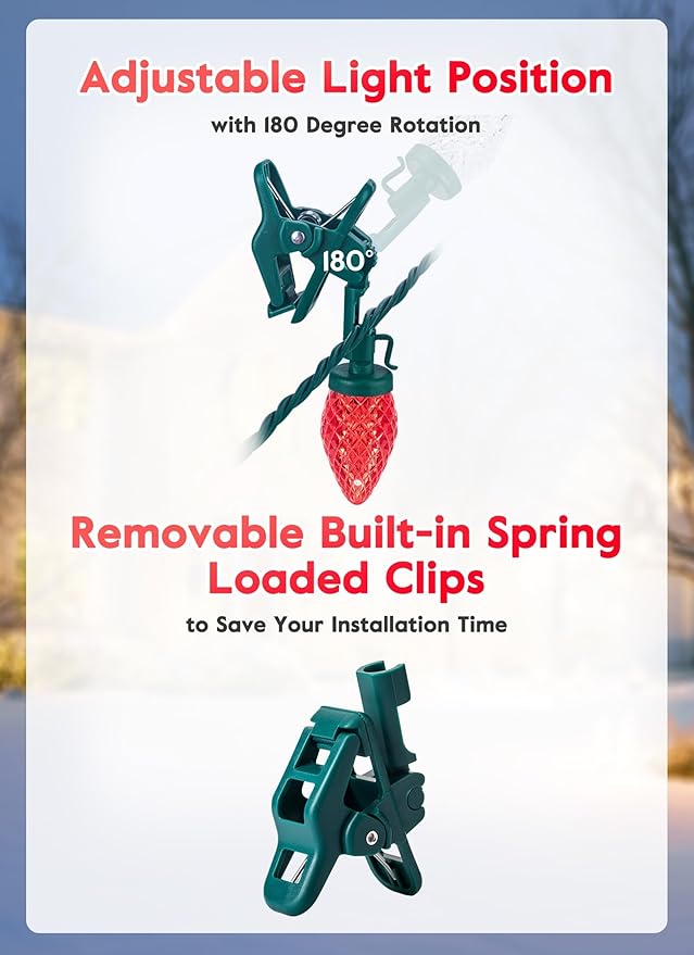 - Convenient Firm Setup and Removeable Quick Clips: These energy efficient C9 LED Christmas lights feature spring-loaded clips that provide a convenient and firm setup. Compared with ordinary clips, the spring-loaded clips can more firmly and securely fastening the lights to various surfaces such as roofs, railings, or trees. The clips can also be easily removed if needed. Perfect for outdoor and indoor use