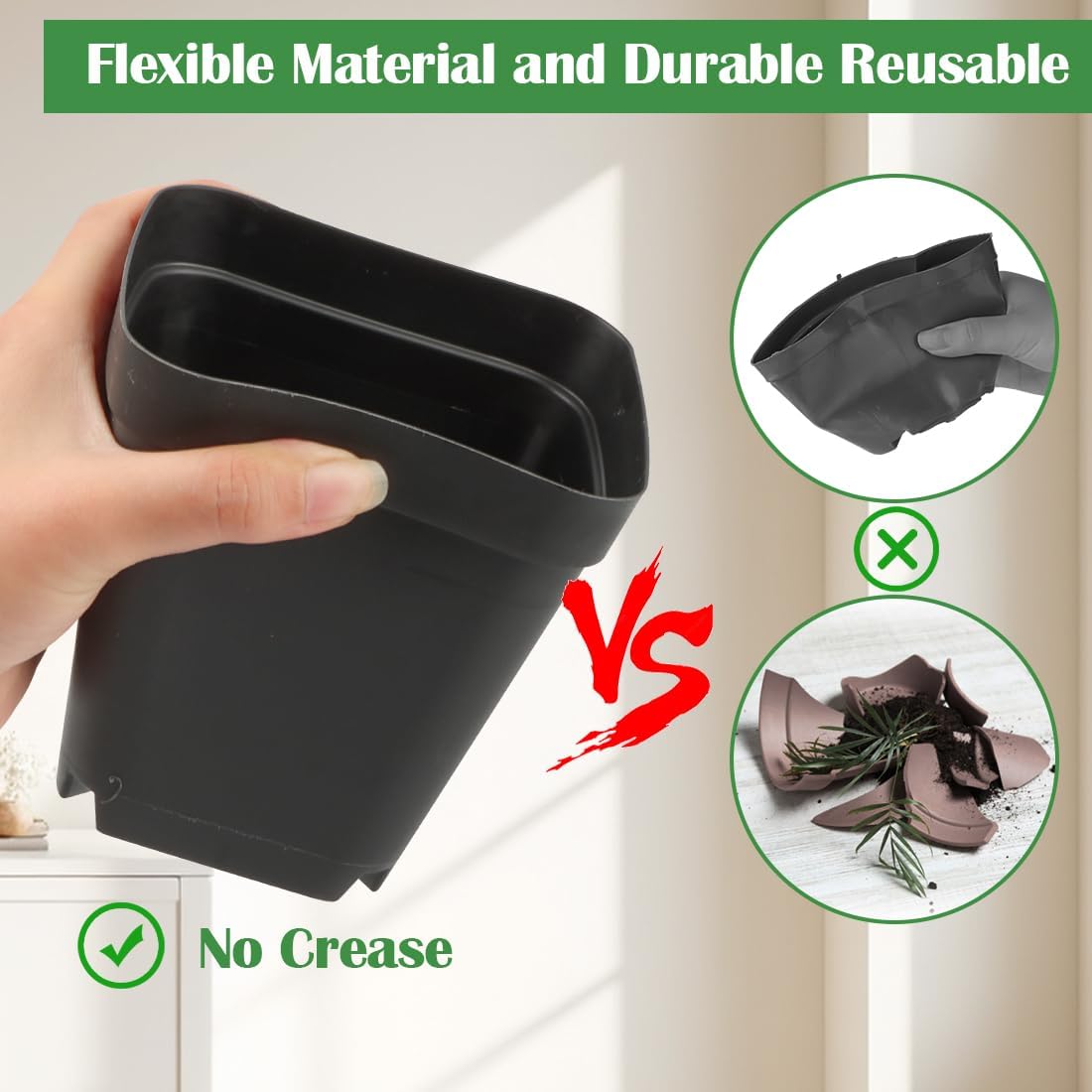 - 【High Quality Material】Our 4 inch square nursery pots with tray, is made of high quality new material, BPA free, with high toughness, not easily deformed, good thickness and easy to transplant. Added anti-aging factor, long life, reusable. When you're using the square box, don't worry about it falling over.