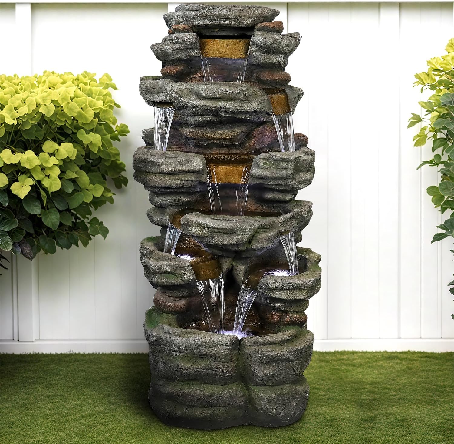 - Relaxing Water Flowing:Enjoy the soothing water flow as it trickles from each tier, mimicking the sounds of a real waterfall, and adding a peaceful ambiance to your outdoor setting,with 7 white lights on the rockery water feature cast a soft and cozy glow, enhancing the overall ambiance with a radiant charm.