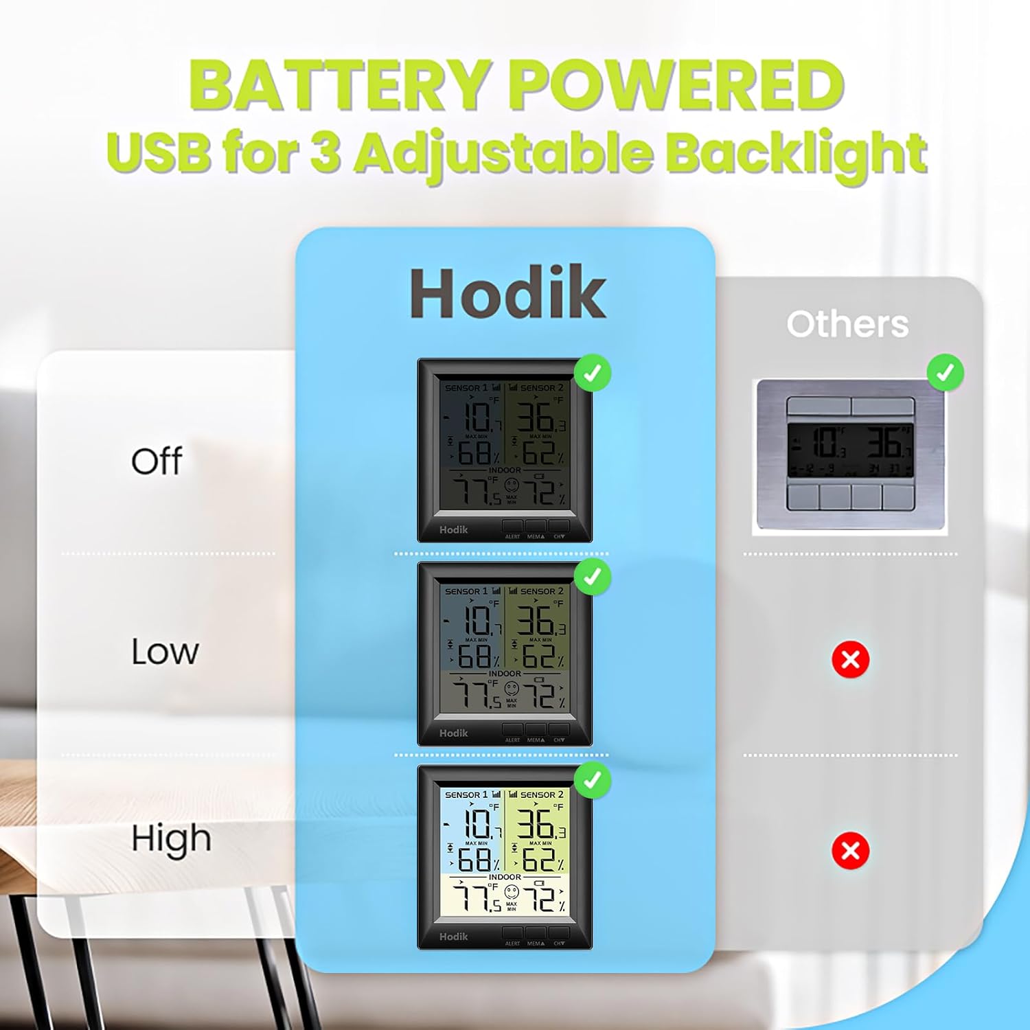 - 【Battery Powered, USB for 3 Adjustable Backlight】: When powered by battery (not included), you can read the rv refrigerator thermometer at day, the screen lights up in color when you touch backlight button and goes off after 10s. With attached USB cable for full functional screen, including constant backlight and adjustable settings (high-low-off).