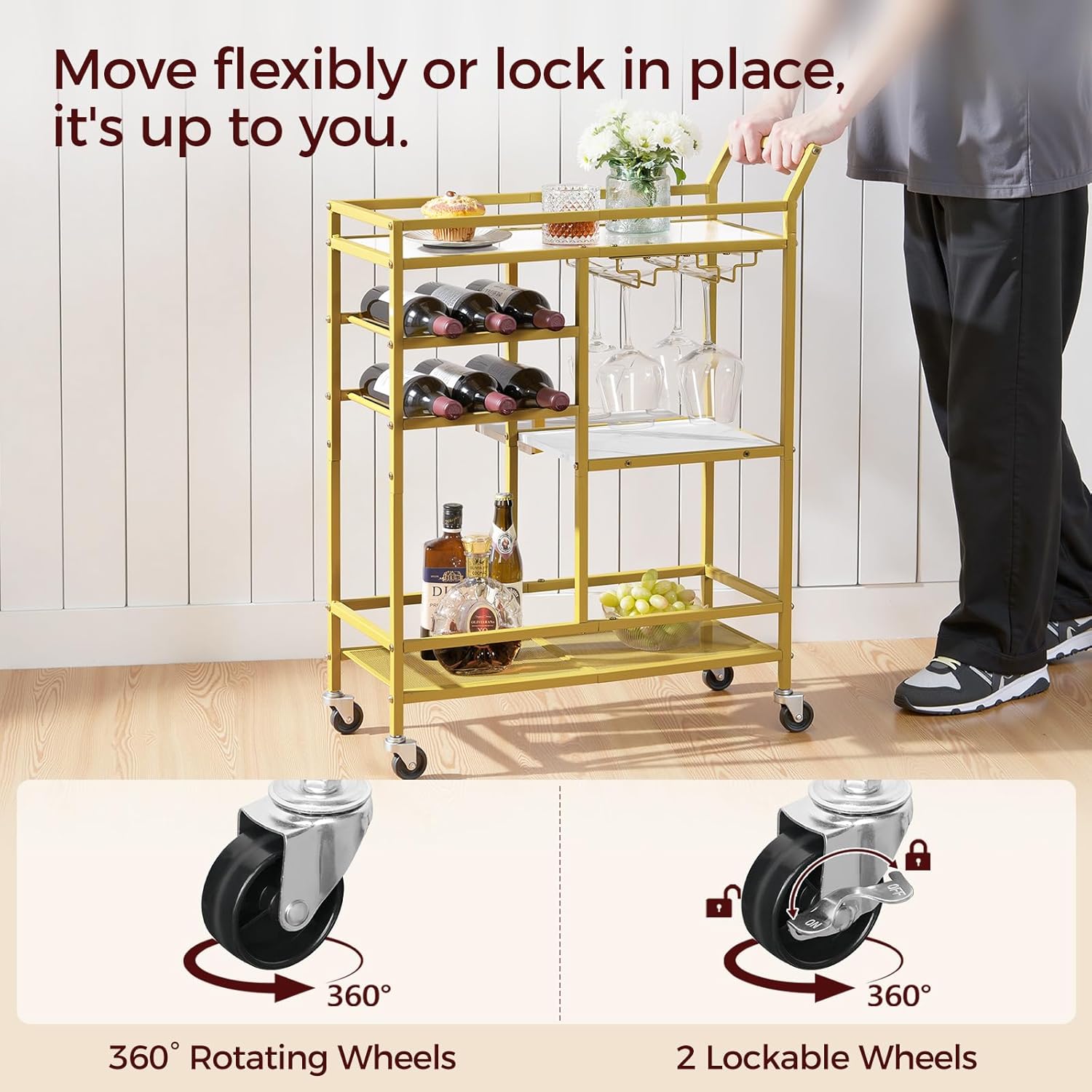 - Flexible Swivel Casters: Equipped with four 360ยฐ swivel casters, two of which are lockable, this bar cart for home glides effortlessly to any location or stays firmly in place when needed, offering both convenience and stability