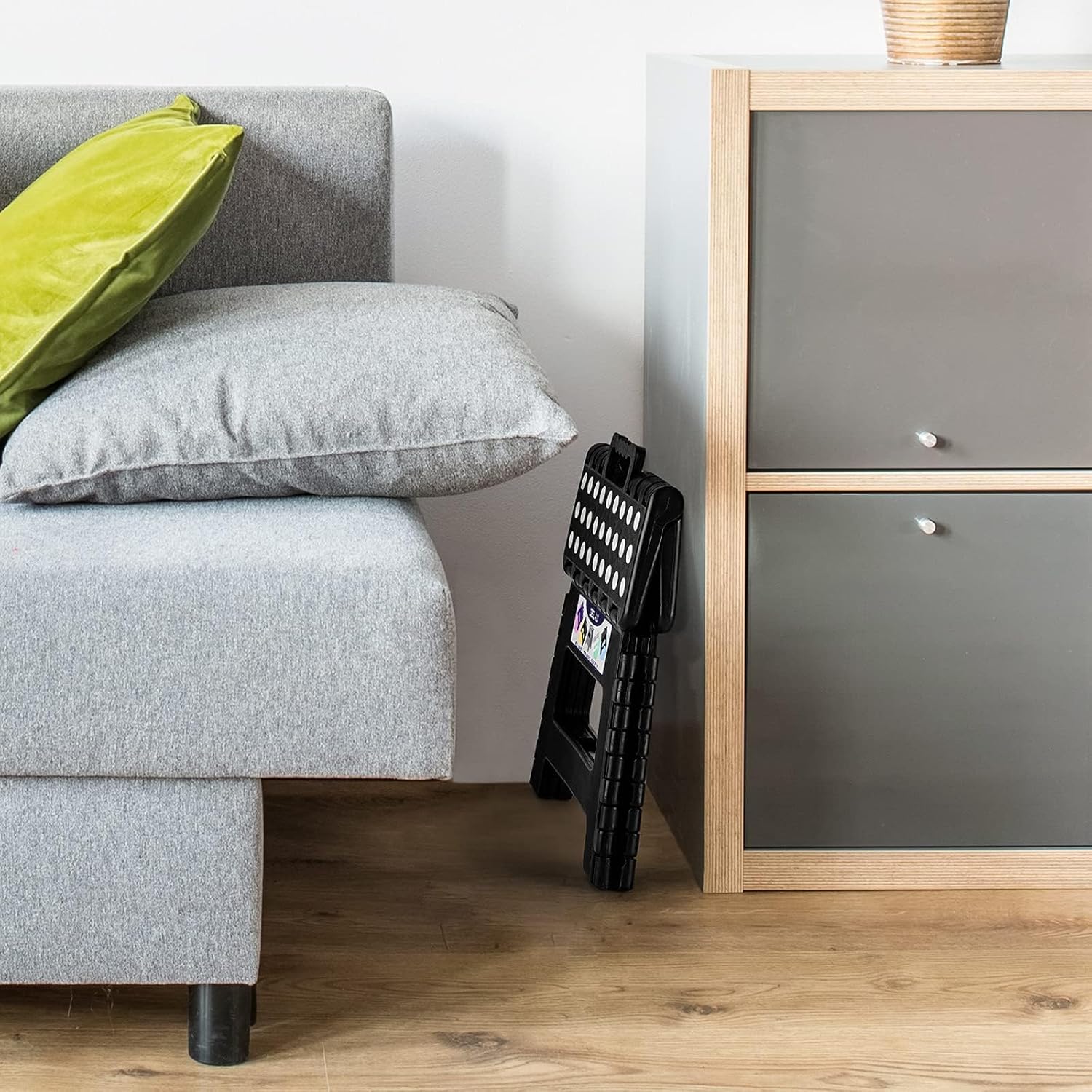 - Sturdy & Safe Black Foldable Step Stool : Our 9inch folding step stool is handy to have around for all sorts of occasions. Compact at 9"H ร12.5"Lร8.5"W when opened and 13.5"Hร12.5"Lร1"W when folded, this durable and strong plastic step stool can support up to 300lbs. It is lightweight and versatile, and can be used both outdoors and indoors in the kitchen, bathroom or office