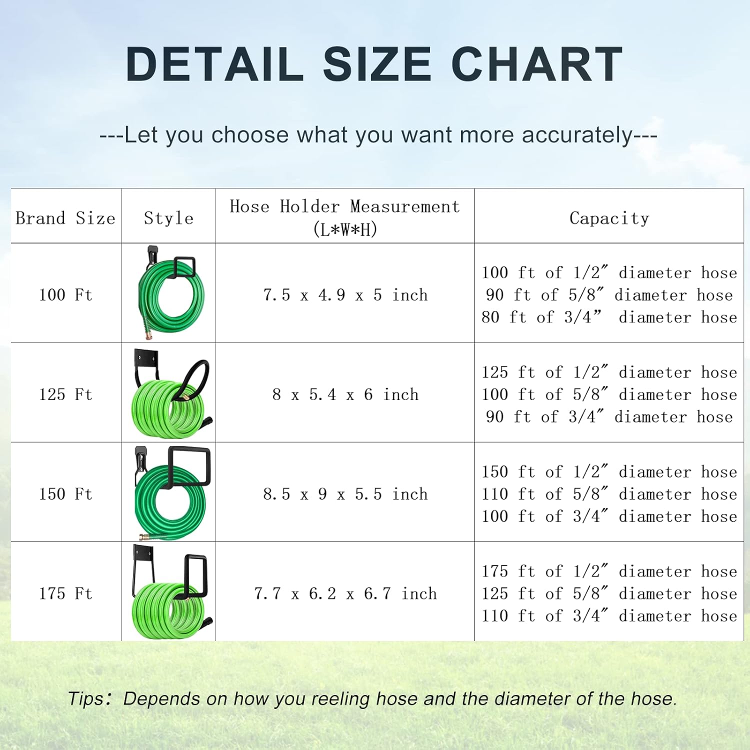 - ---Package Included--- Water Hose holder x 2,Screw x 4, Drywall anchors x 4, Product Size:7.5 x 4.9 x 5 inch(L*W*H)