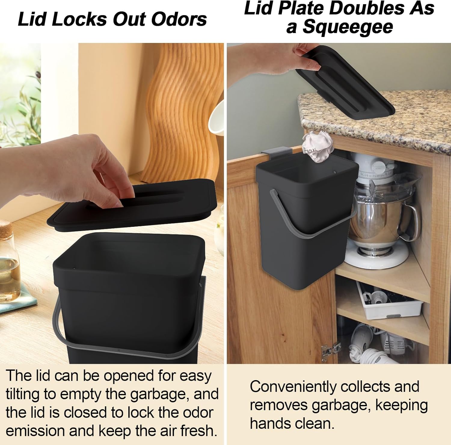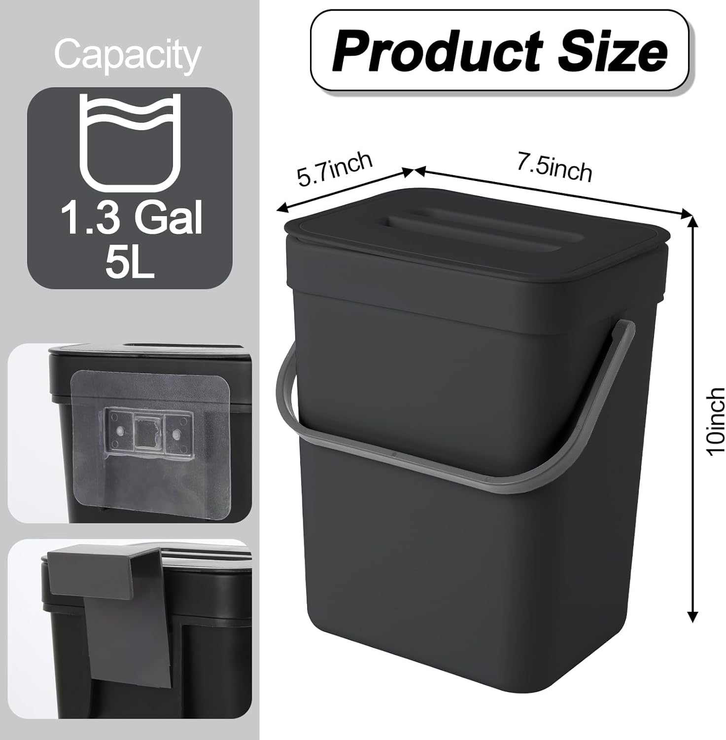 Compost Bin Kitchen, for use on Countertops or Under Sinks, Hanging Trash Can with Lid, for Cupboard/Bathroom/Bedroom/Office/Camping, Mountable Indoor Compost Bucket(Black 1.3 Gallon/5L)