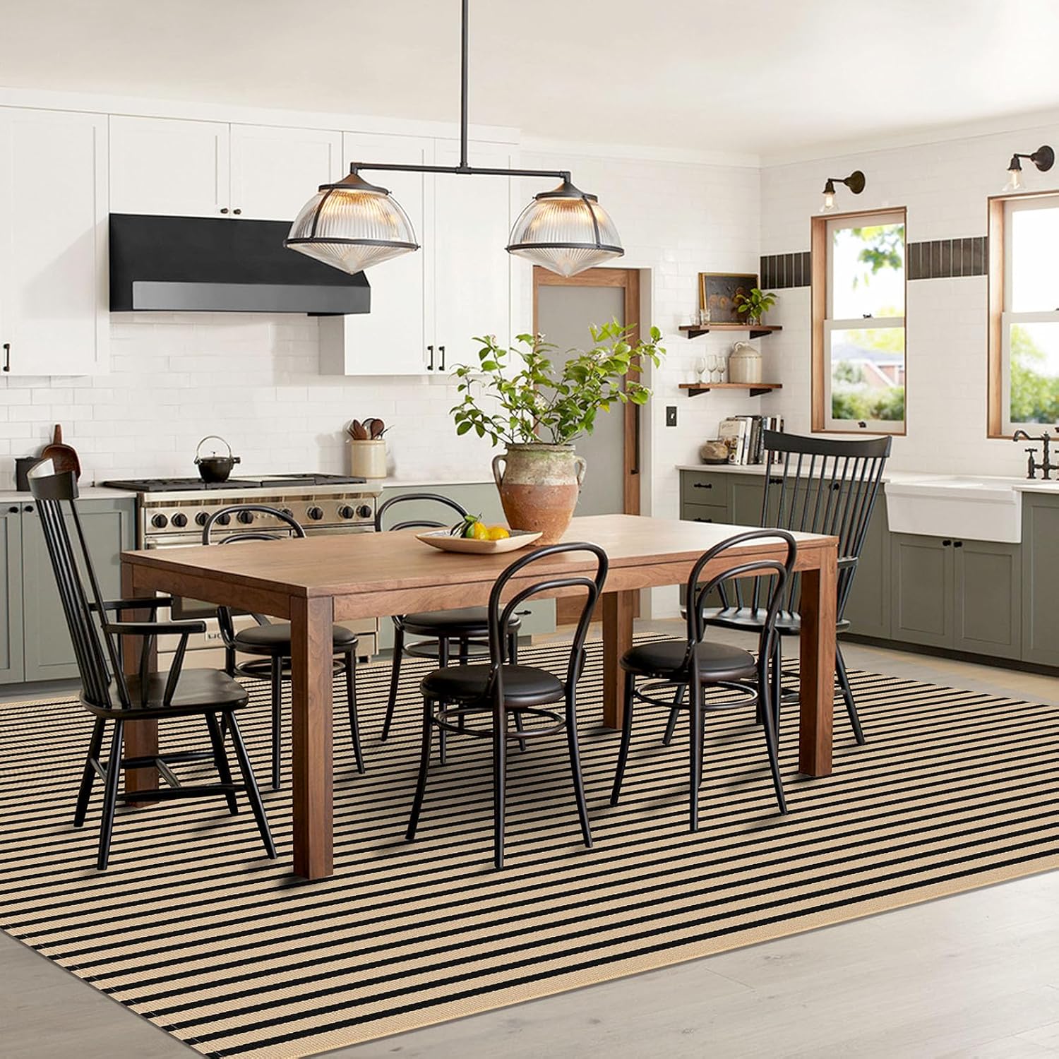 IOHOUZE Striped Area Rug 8'x10' Indoor Outdoor Rug, Washable Area Rug for Living Room, Large Patio Rug, Cotton Striped Rugs for Patio Living Room Bedroom, Tan/Black