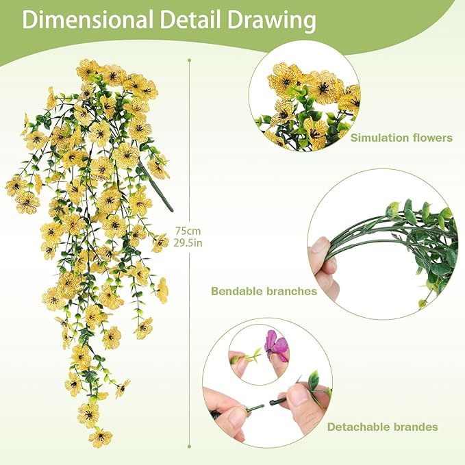 - Artificial Flowers for Outdoors: Our 6 Bundles of Artificial Hanging Flowers are beautiful and real,it includes yellow x1, red x1, purple x2 and rose red x2, soft petals,leaf texture clear, maintain their vibrant hues all year, making them ideal faux flowers for outdoor planters. Note: The product may have a slight smell during transportation. If used indoors, please ventilate before use.