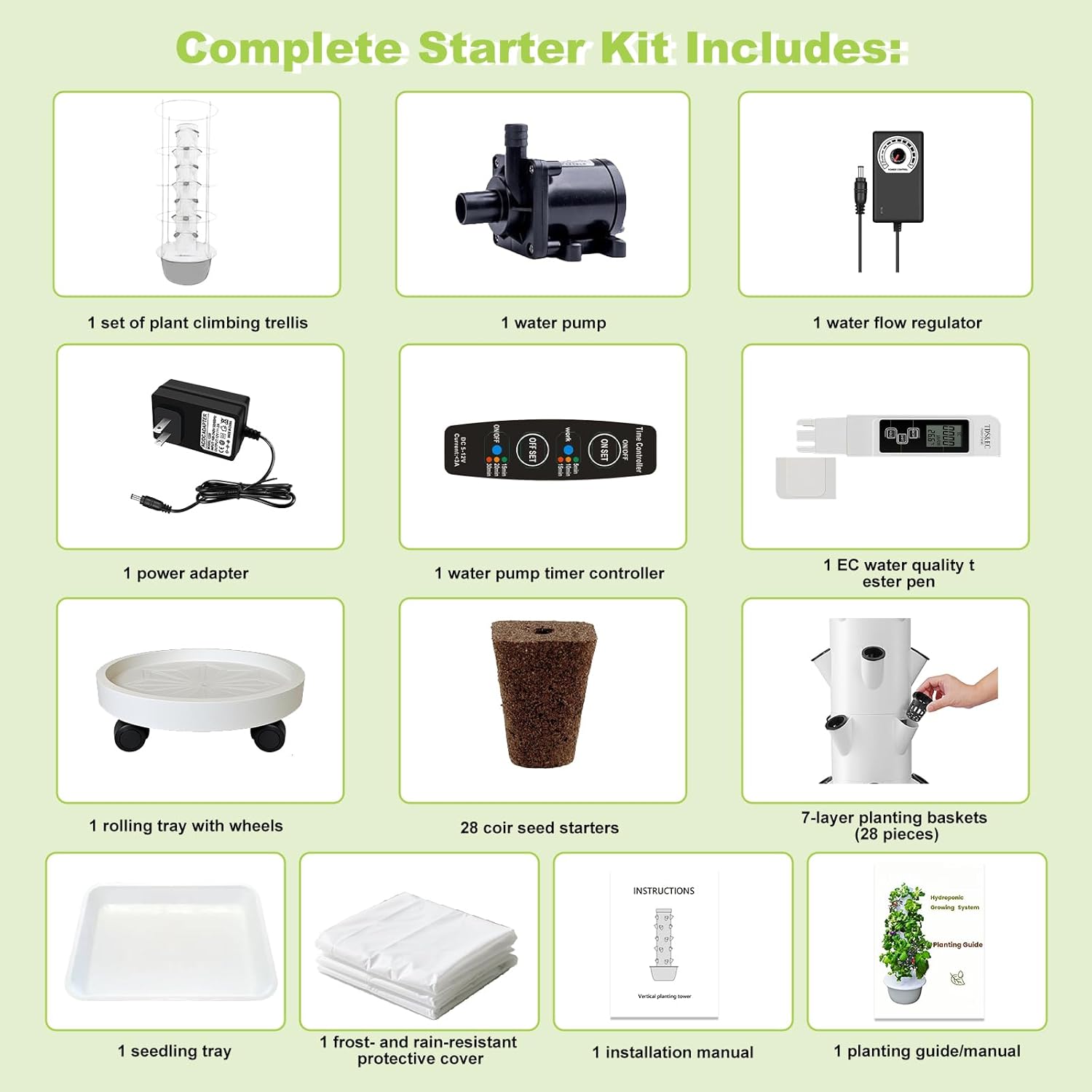 - [All-in-One Kit with Automatic Operation – Perfect for Beginners] Comes fully equipped with everything you need: water pump, filter, timer, water flow regulator, 28 planting baskets, 28 coco seed starters, seedling tray, EC tester pen, rolling base, rain cover, and climbing support frame. Easy to assemble and beginner-friendly—once set up, the system runs automatically with minimal effort, no gardening experience required.
