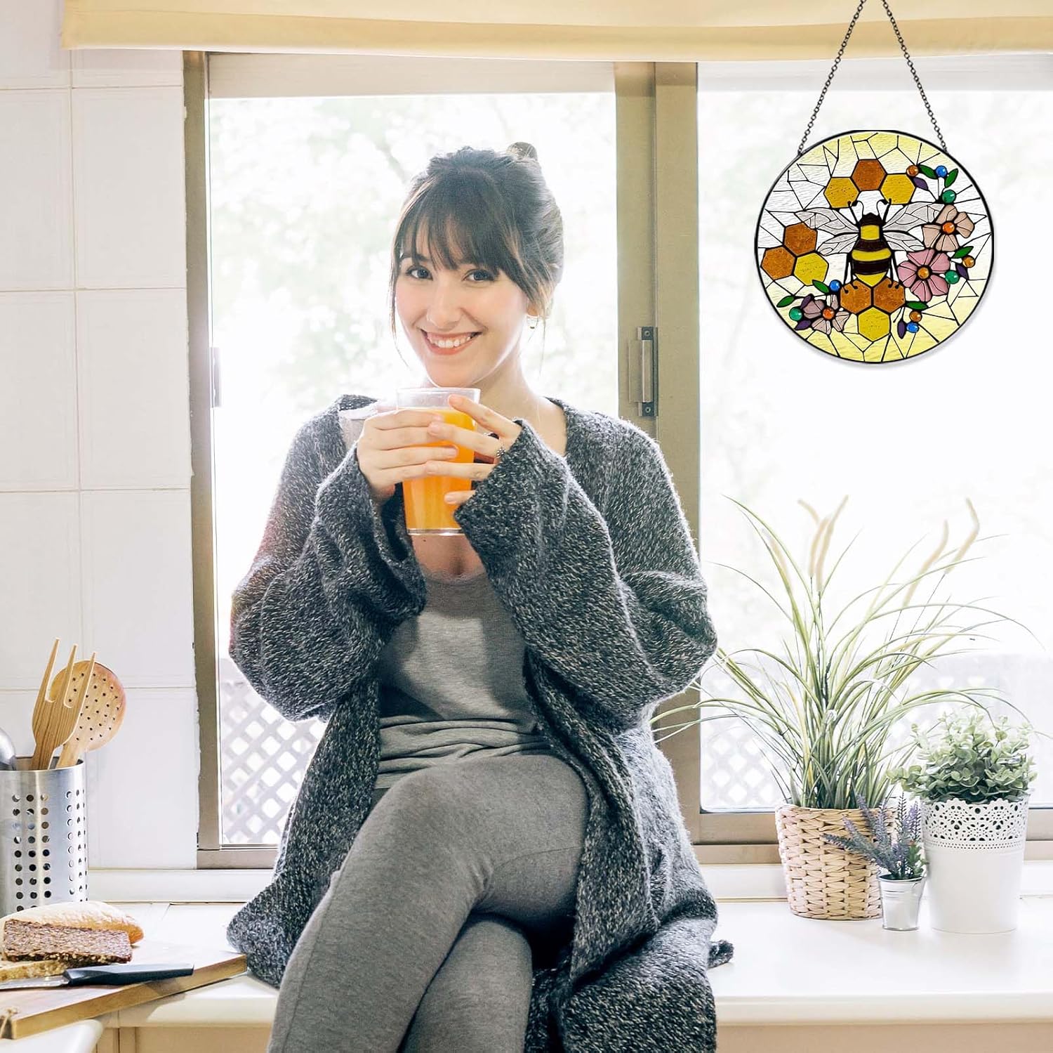 Honeycomb Sun Catcher Stained Glass Window Hanging Gifts for Women Bee Wall Decor Handmade Sun Catcher Decoration for Home Garden Housewarming Gifts