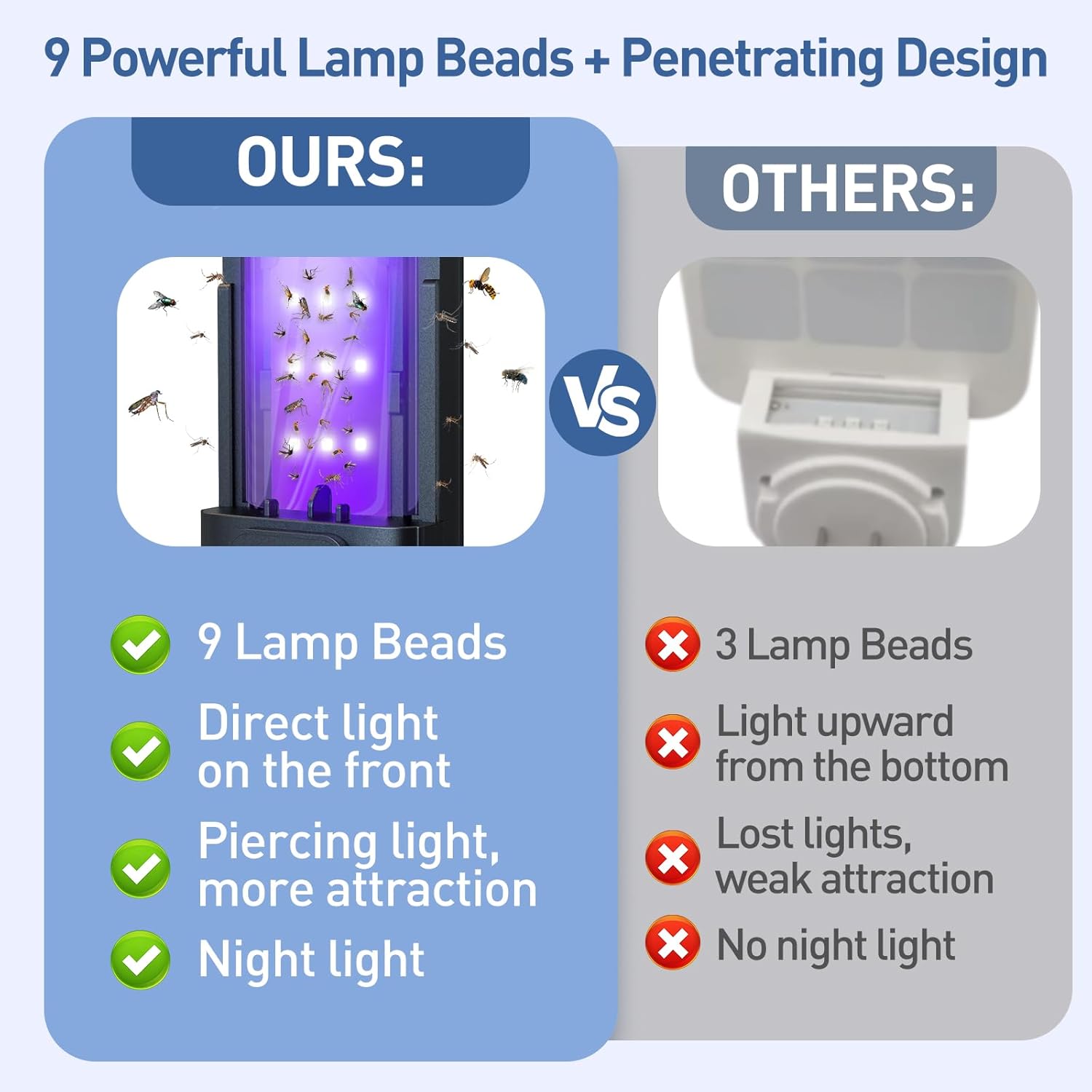 - 【Upgraded Fly Trap Indoor】Traditional fly traps have flaws: lamp-post type designs lose 50% capture rate due to gaps, while bottom-upward light types waste 50% of the divergent light. Our solution adds 9 LED lamp beads on the back-panel that diffuse puncture light onto a transparent glue board, so that the flying insects 90% can be trapped on the transparent glue board by the puncture light.