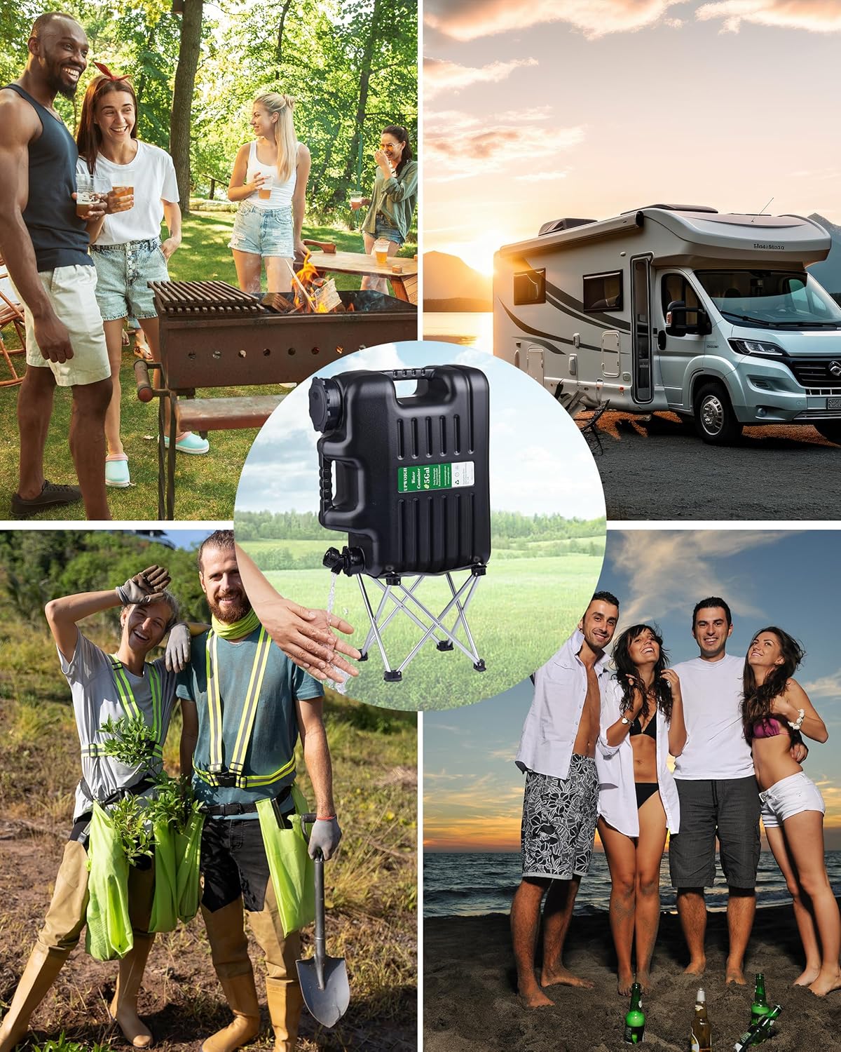 - Portable and Easy to Store:Designed for convenience, the jug features a strong built-in handle for easy carrying. Both the water container and folding stand are collapsible, allowing for compact storage and effortless transport—perfect for car trunks, RVs, and camping gear.