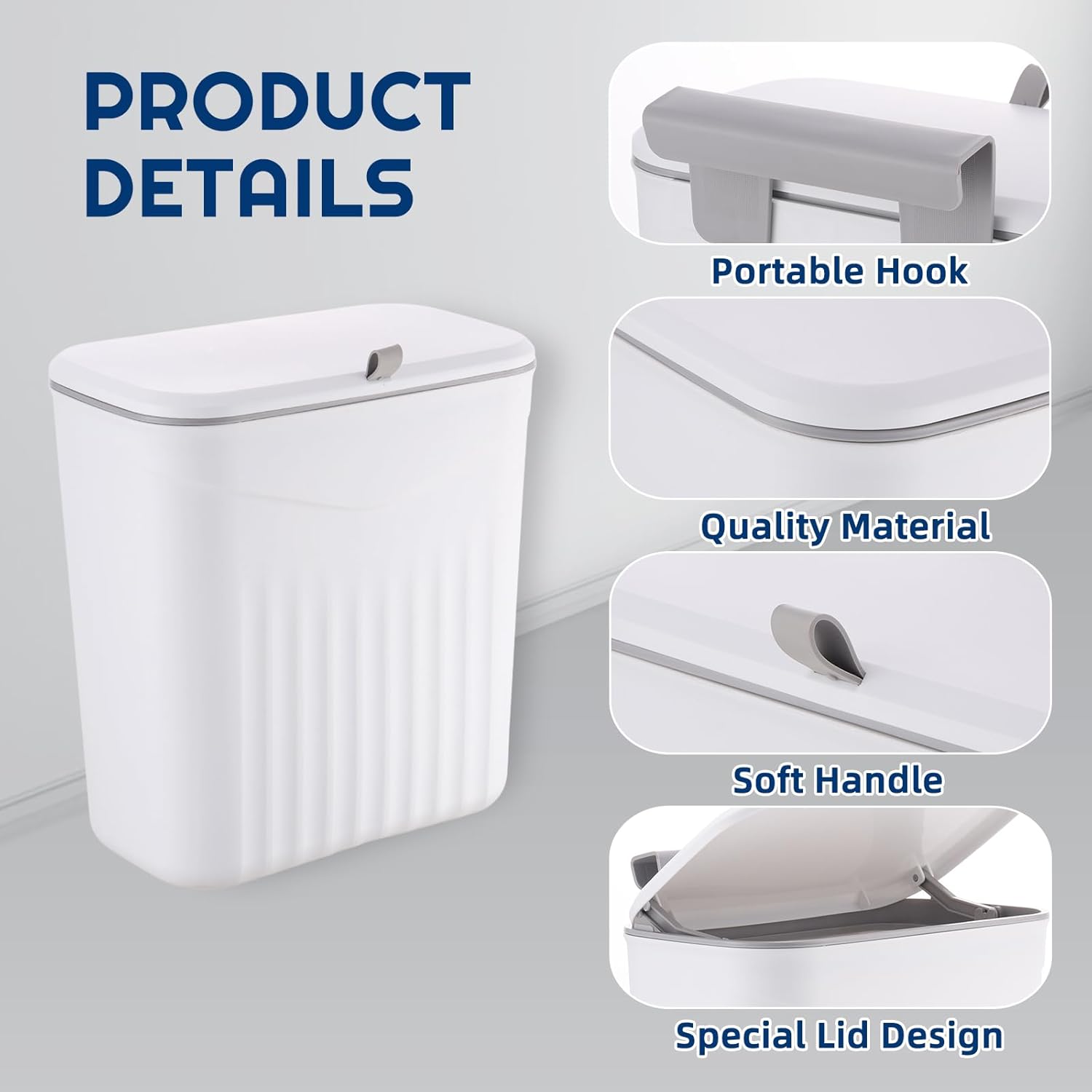 - ✅KITCHEN TRASH CAN: The hanging trash bin measures 11.2*10.2*6.1 inches and has a capacity of 2.6 gallons. The bin does not take up much countertop space. It can be placed on the countertop, under the sink or in the pantry, perfect for living spaces such as dorms, flats, RVs, cabins and campers.