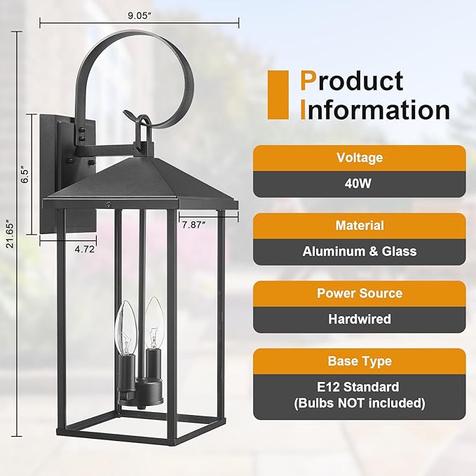- 【E12 Socket & Recommended Bulbs】These large front porch sconce are built in standard E12 socket(40W Max).It compatibles with various bulbs, such as LED, Incandescent or CFL bulbs.(Note: Bulbs and dimmer are NOT included)