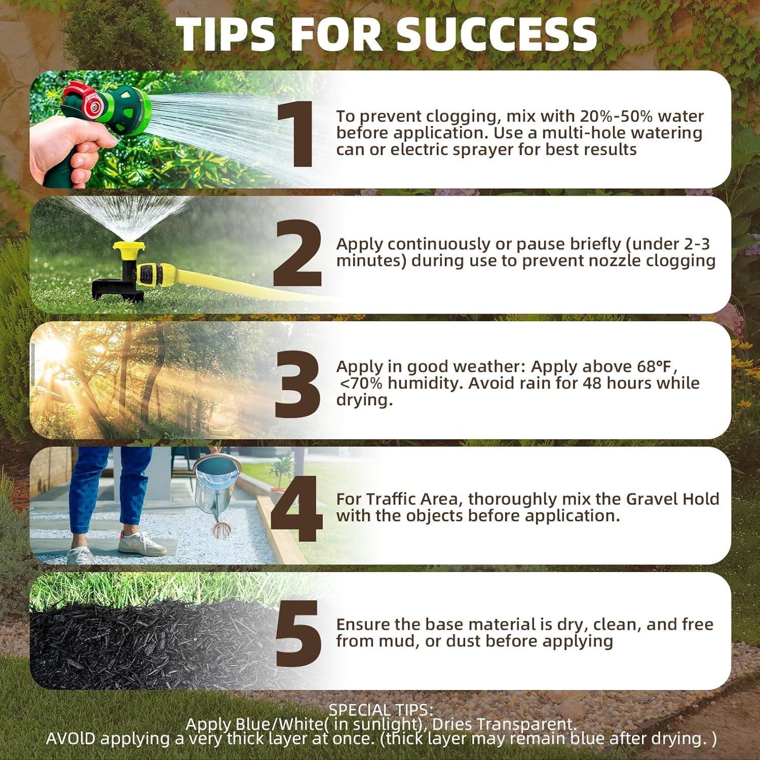 - ăKeep Your Landscaping Perfectly in Place with Our Professional Gravel Glue/Pebble GlueăThis Heavy-Duty Gravel Glue Securely Locks Mulch, Wood Chips, Gravel, Sand, Shells, Pine Straw, and Decorative Stones, Preventing Wind and Water Displacement. Ideal for Erosion Control on Slopes, Uneven Terrain, Driveways, and Garden Beds, Our Rock Glue Weather-Resistant Formula Provides Long-Lasting Protection Against Washouts and Blowaways While Stabilizing Loose Materials.