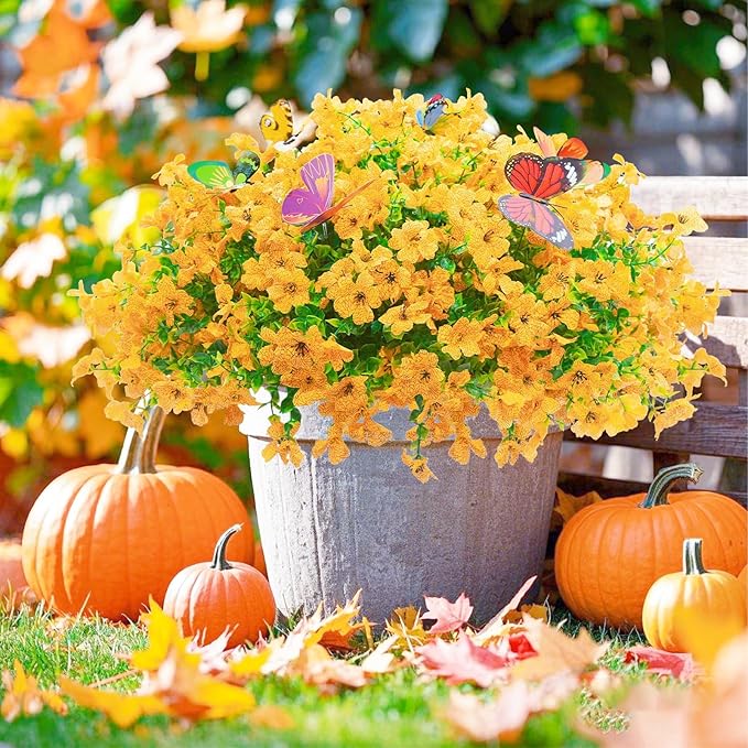 - Package Contents: This set includes 20 bundles of outdoor artificial flowers and 6 vivid faux butterflies(randomly color). Each fake outdoor plant features 7 flexible stems adorned with eucalyptus leaves and chrysanthemum blooms. Pot and Pumpkin not included.