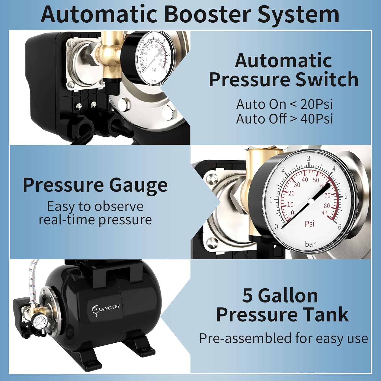 - Easy Operation - This shallow well jet pump is easy to operate, starts at 20psi and shuts off at 40psi, and comes with a pressure switch and external pressure gauge for real-time visibility into your tank. Compact 5 gallon pressure tank prolongs its service life. Waterproof On/Off switch ensures the safe operation