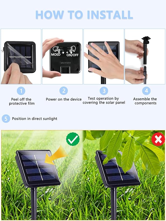 - 8 Lighting Modes & Auto On/Off & Memory Function: The solar twinkle lights have 8 lighting modes for selection. After powered on, just press the mode button to choose your favorite mode to satisfy your diverse needs. And the built-in memory chip saves your last mode setting, so there is no need to reset it everyday. It is very convenient for use outdoor. With the built-in light sensor, the lights will turn on at dusk and turn off at down automatically