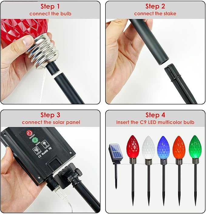 - [Solar powered and automatic switch]: The jumbo C9 LED Christmas lights are solar powered, waterproof, no electricity bill. upgraded solar panel adopts fast charging technology with higher solar energy conversion rate and can work for 10-12 hours (8 hours) after fully charged. simply place the panel in a sunny location and it will automatically charge during the day and light up at night.