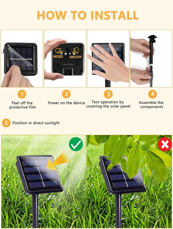 - 8 Lighting Modes & Auto On/Off & Memory Function: The solar twinkle lights have 8 lighting modes for selection. After powered on, just press the mode button to choose your favorite mode to satisfy your diverse needs. And the built-in memory chip saves your last mode setting, so there is no need to reset it everyday. It is very convenient for use outdoor. With the built-in light sensor, the lights will turn on at dusk and turn off at down automatically
