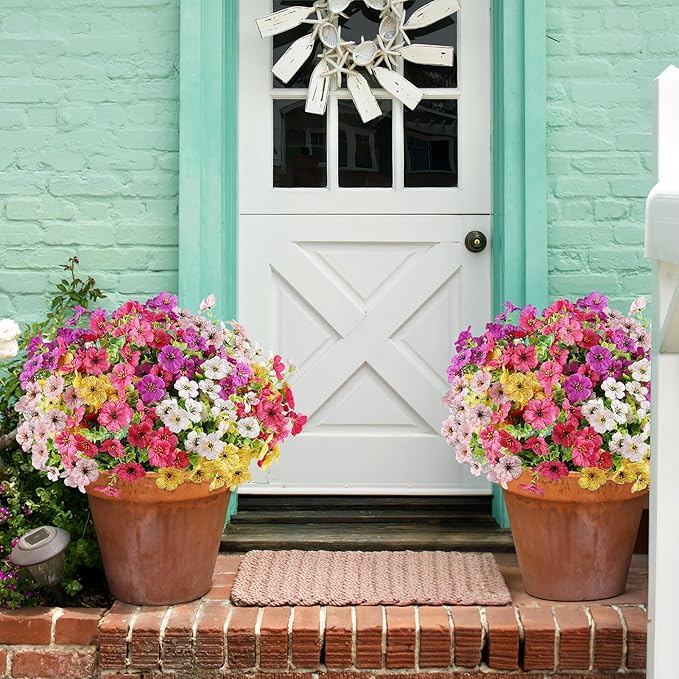 - Perfect for Outdoor/Indoor - Plastic flowers are ideal for outdoor porches,walkway,terraces windox box,front yard,pots,hanging planters,gardens,landscape,windowsills, allowing you to have beautiful colors all year around.Also suit for birthdays, Halloween decor, memorial place or grave,they can live anywhere and have withstood heavy rain storms and winds.