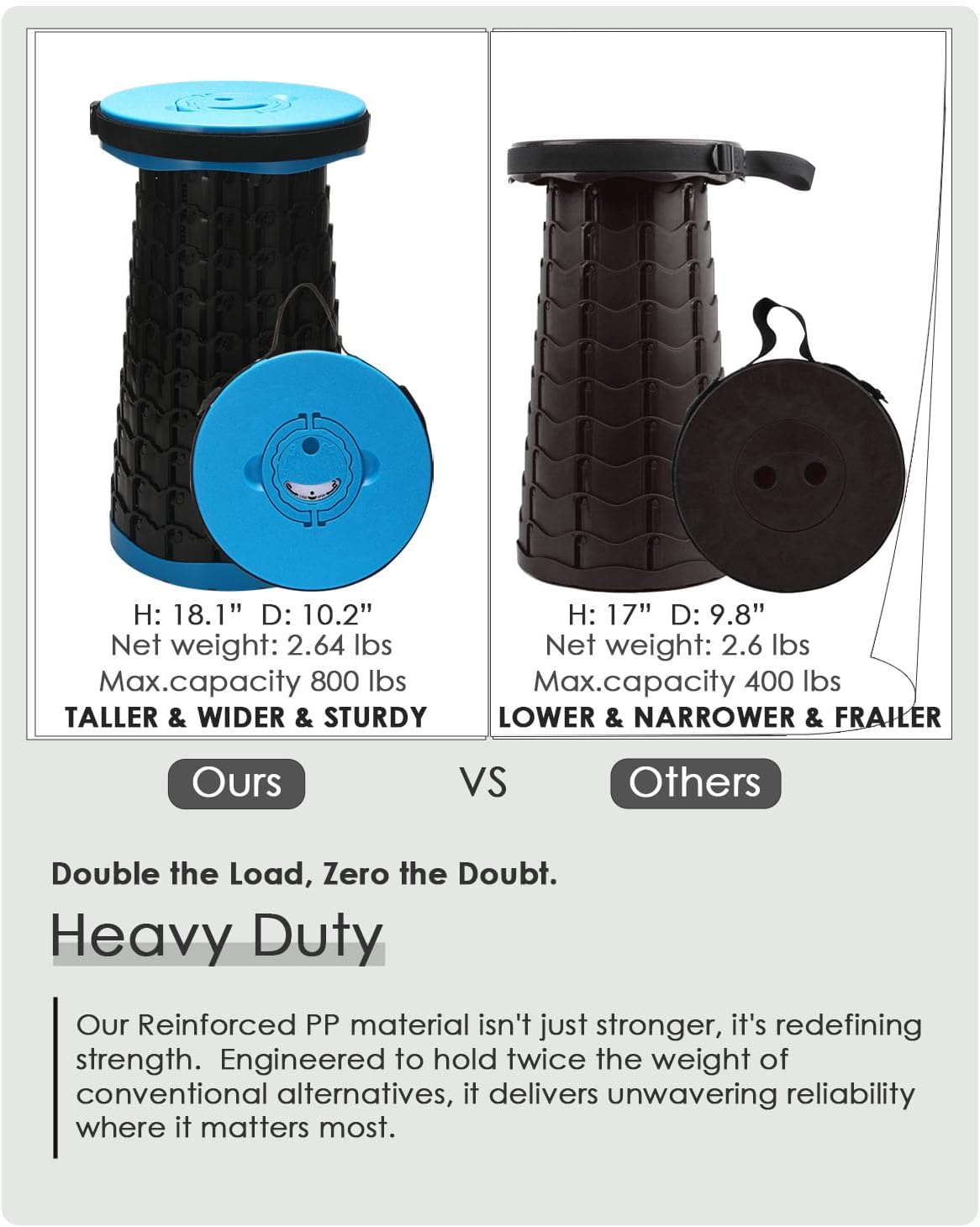 - 800 LBS HEAVY-DUTY CAMPING STOOL β Reinforced PP material, delivers double the industry strength, creating ultra-safe portable stools for adults of most sizes.