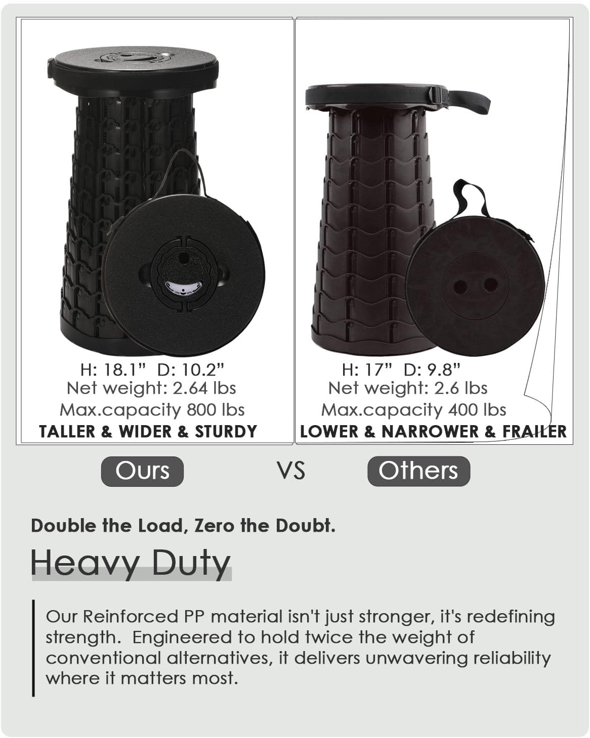 - 800 LBS HEAVY-DUTY CAMPING STOOL β Reinforced PP material, delivers double the industry strength, creating ultra-safe portable stools for adults of most sizes.