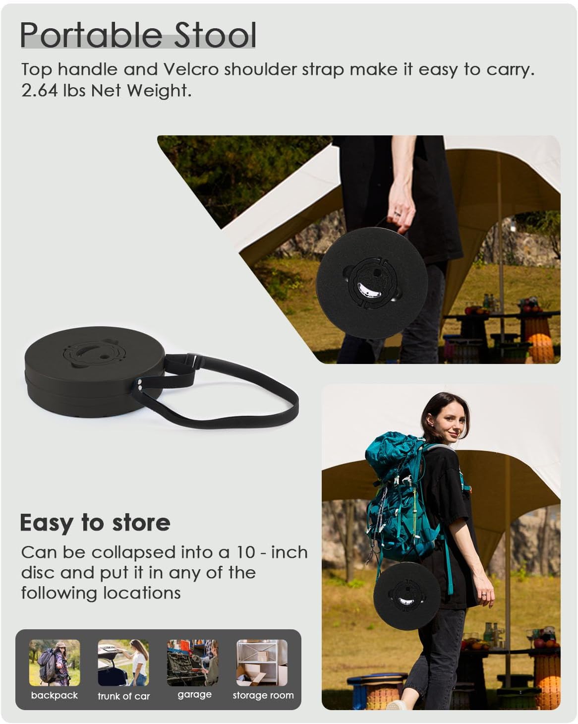 - LIGHTWEIGHT PORTABLE FOLDING STOOL β Only 2.64lbs! Folds compact to 10.2"(D)x2.6"(H) with handle & shoulder strap. Perfect lightweight collapsible stool for backpacks or car trunks.
