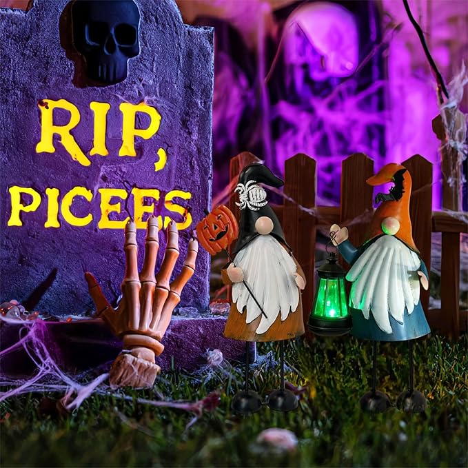 - 【Halloween Gnomes Decorations】Featuring gnomes wearing witch hats decorated with spiders and bats, one holding a solar lantern, another holding a Metal Spooky Pumpkin Stakes.The scare Halloween elements are designed to give your yard, lawn or garden an instant festive and surprising look