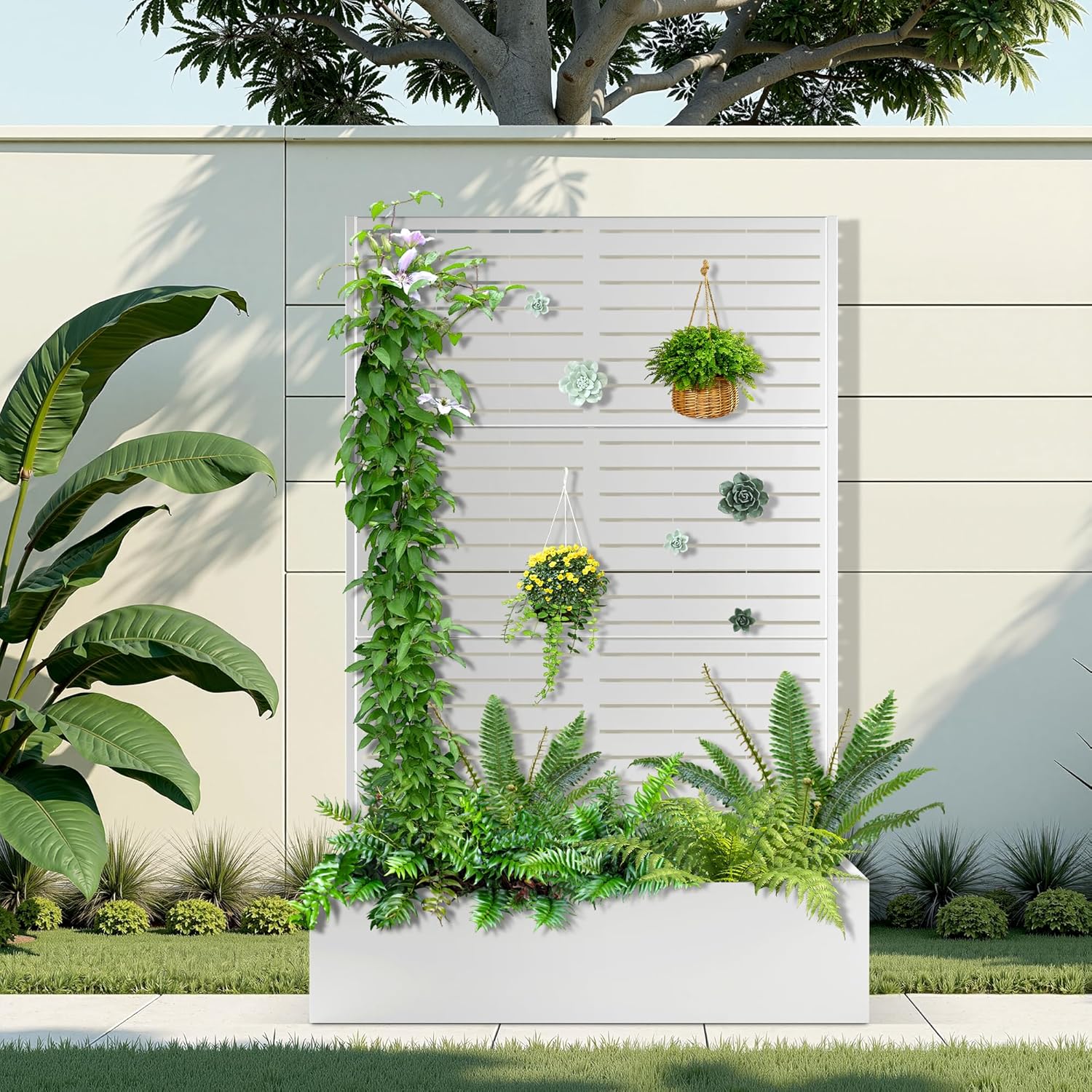 Metal Raised Garden Bed with Trellis, 2 in 1 Trellis with Planter Box & Privacy Screen for Climbing Plants, Vine, Outdoor Standing Flower Beds with Drainage Holes, 47" L x 16" W x 71" H, White