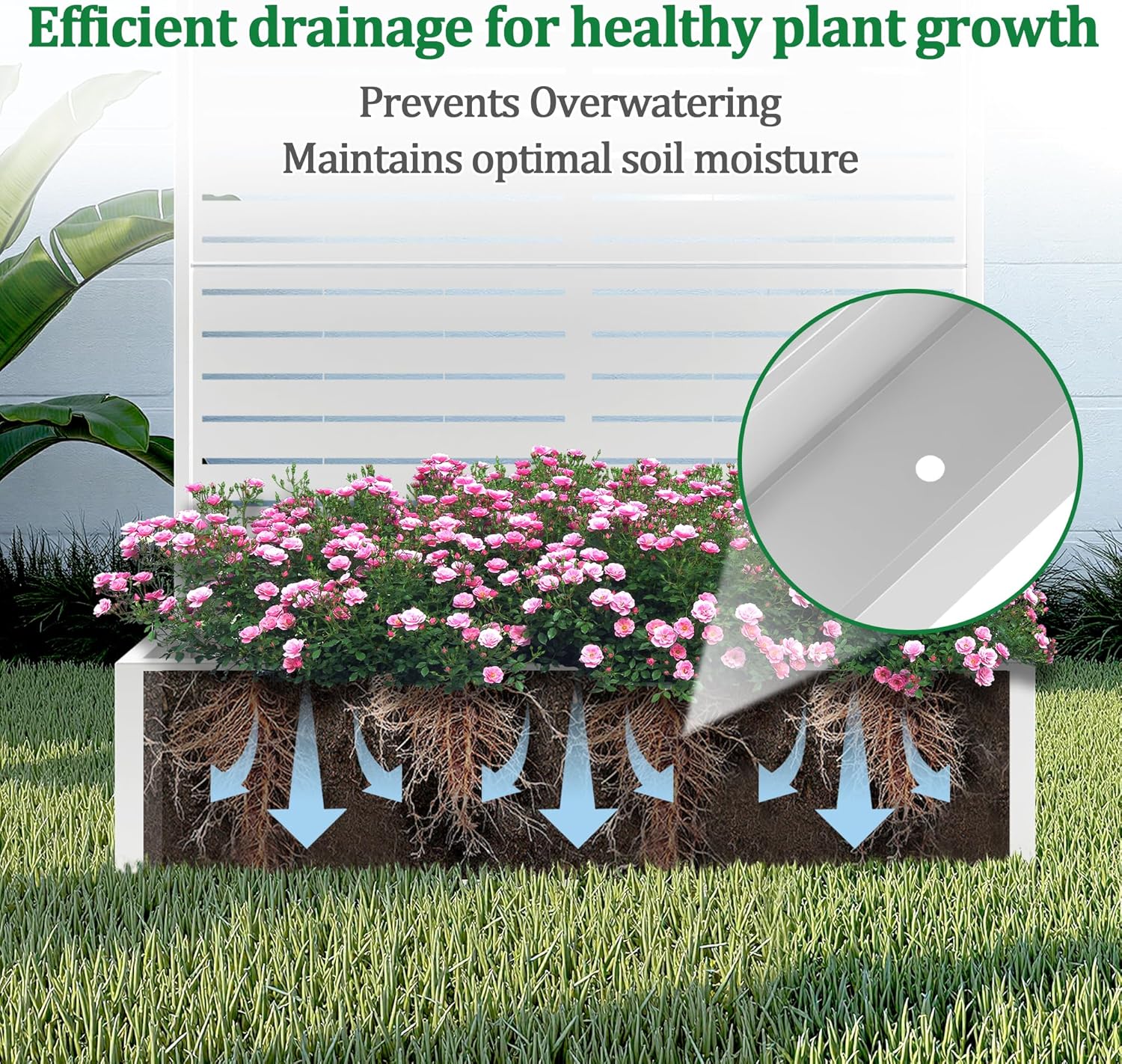- Optimal Water Management: The planter with trellis features a deep planting bed, offering generous space for healthy root development. The raised garden bed also comes with built-in drainage holes that efficiently prevent water accumulation, helping your plants maintain proper moisture levels for optimal growth.