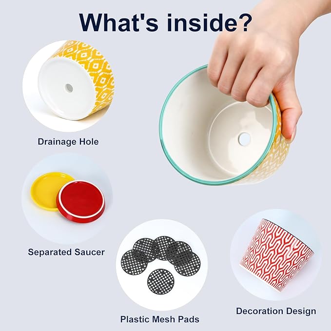 - 【CERAMIC SAUCER & MESH PADS】Each succulent planter comes with a saucer and a mesh pad. The drip saucer with rim can collect excess water filtered from the soil. While the mesh pad keep soil from migrating out of the drainage hole and keeping it unblocked for a long time. These match well each other to promote your plant health growth.