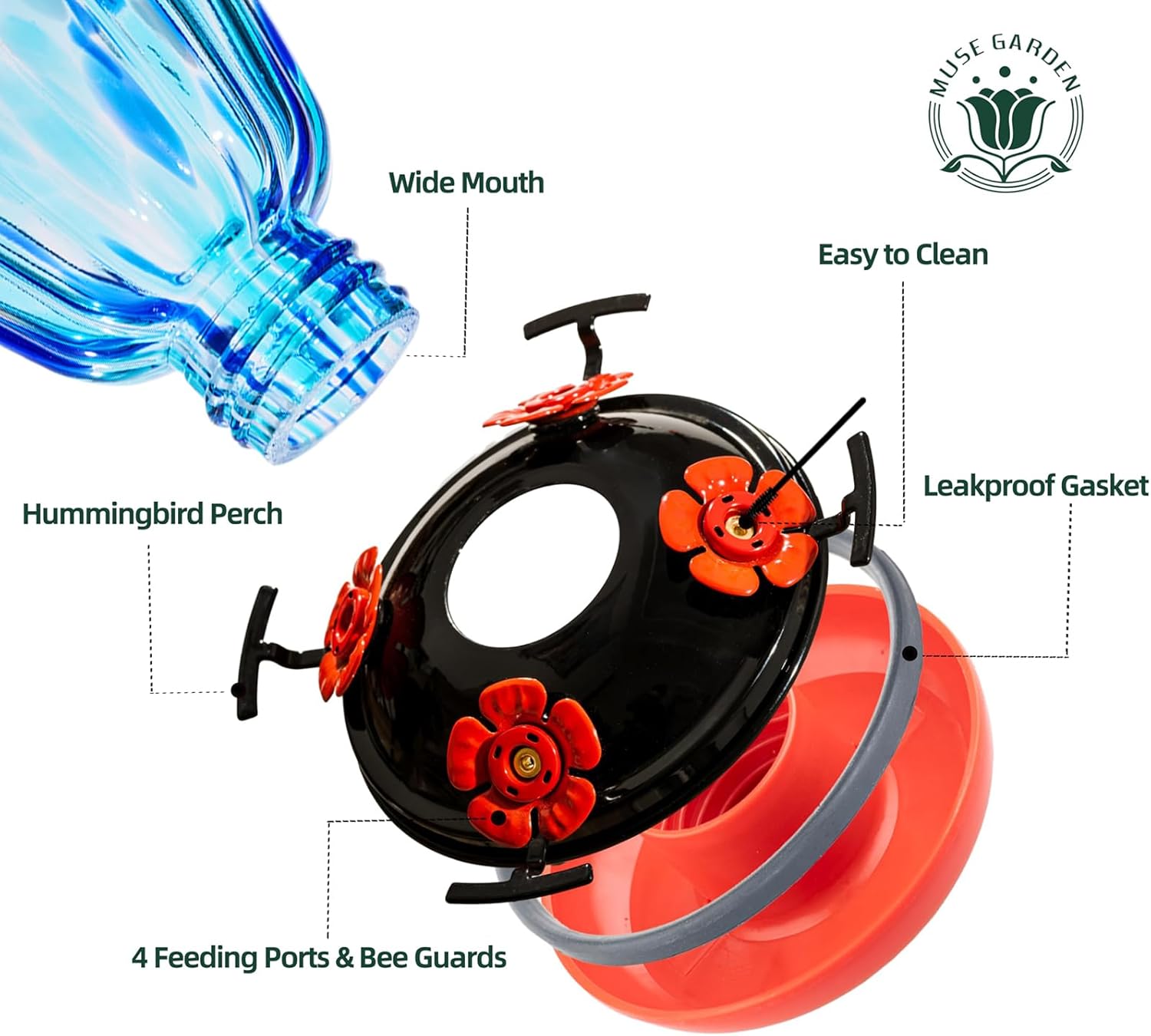 Muse Garden Solar Hummingbird Feeders for Outdoors Hanging, 38oz Hand Blown Glass Humming Bird Feeders for Garden Decor, Moms Birthday Unique, Blue