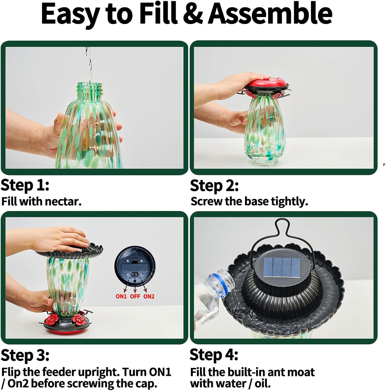 - 【Solar Powered & Eco-friendly】Please turn “ON1/2” before charging, the solar garden light will automatically light up at night. Sufficient sunlight charging 6-8 hours, our solar hummingbird feeder for outside can work 8-10 hours. (BE SURE TO ADJUST THE SWITCH TO EITHER ON1 OR ON2 IN ORDER TO CHARGE BY SUNLIGHT OUTDOOR)