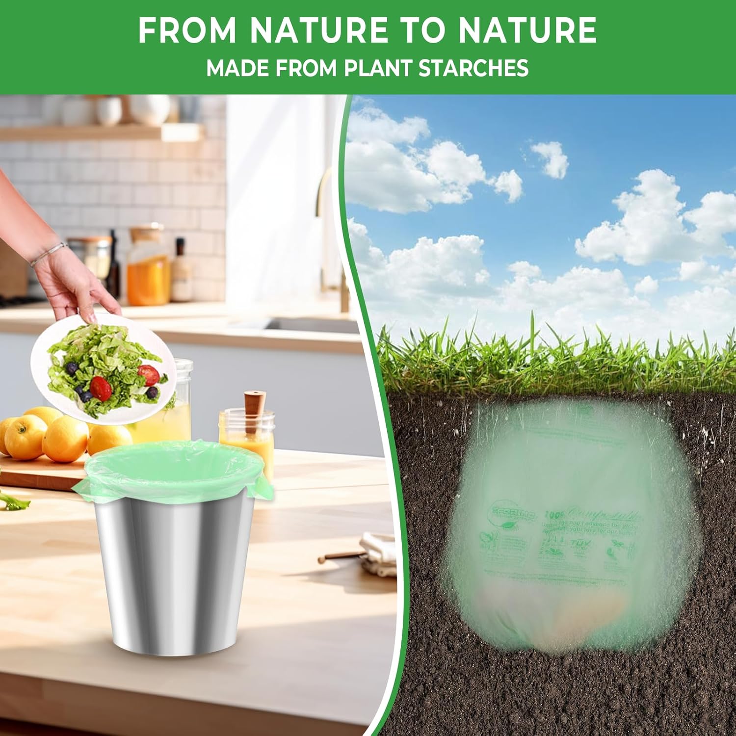 - 【BPI-CERTIFIED】Independently verified to ASTM D6400 standards, these 1.6-gallon bags decompose in commercial facilities within 18 weeks - perfect for city green bin programs.
