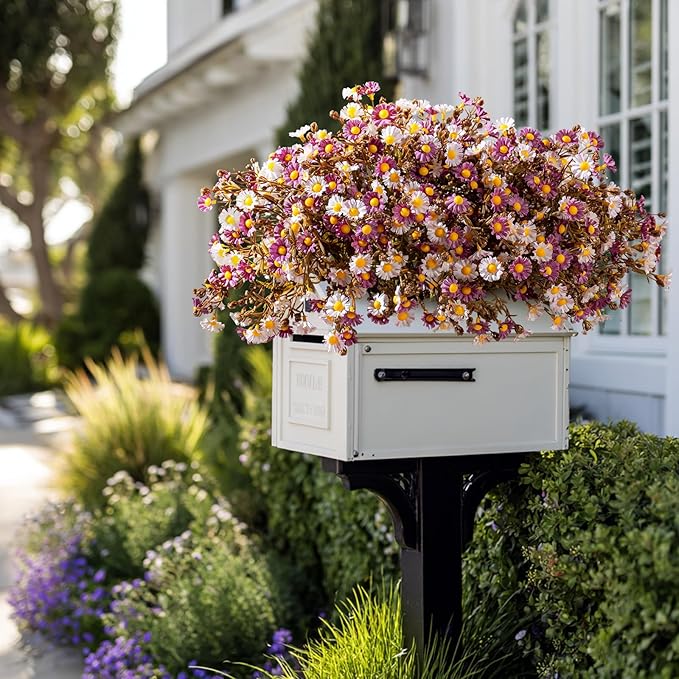 - REALISTIC ARTIFICIAL FLOWER: The bundles come in a variety of vibrant, lifelike colors that mimic real flowers to perfection. Each fake daisy flower come as close to real as can be, offer true-to-life petal and foliage textures. The outdoor fake flowers are made from high-quality plastic that withstands the elements, and don't worry about them fading or wilting under the sun or rain.