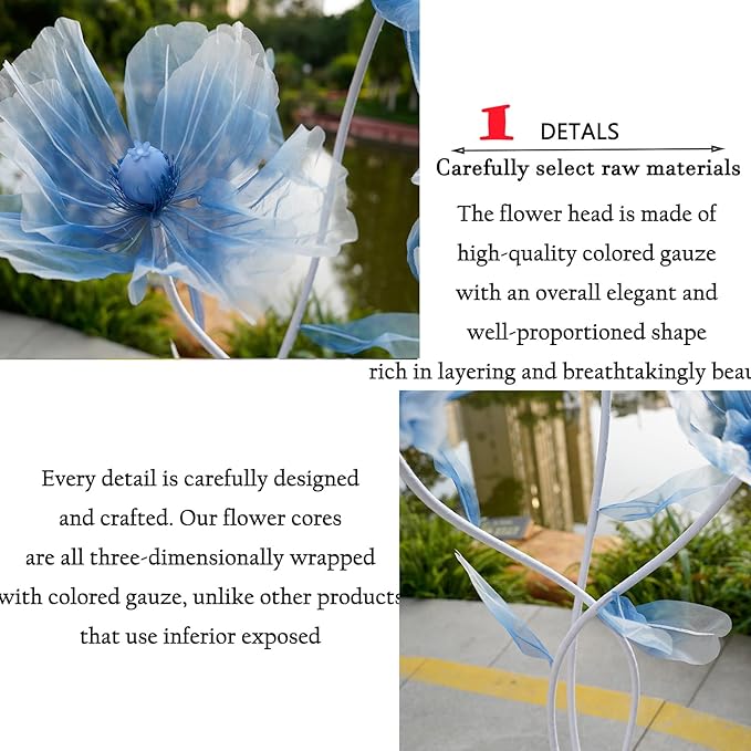 - 【Precise Dimensions & Grand Visual Impact】 Set Includes: Base ×1, Stems ×3, Flower Heads ×3 (31.5 in / 23.6 in / 15.7 in). Assembled height approximately 66.9 inches (≈170 cm). Three giant artificial flowers arranged at varying heights create a stunning focal point with dramatic visual impact for any space.