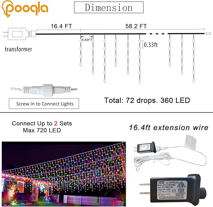 - Long LED String Lights: The length of each string light is 58.2 FT, provide with an extra 16.4 ft Lead cable. Totally 72 drops of string lights with 360 multicolor LED lights. Detailed dimension in picture