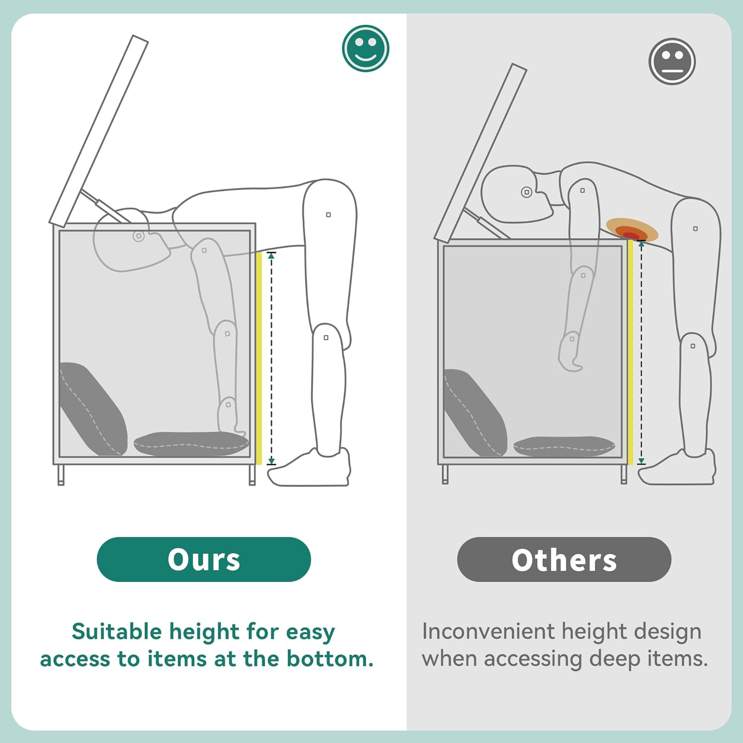 - Unique Design- The lower front panel is ergonomically designed so that even the innermost items are easy to reach; Easy lift and soft close mechanism enables the top to gradually open and shut with minimal effort, great for prevents smashed fingers; High leg design keeps the interior storage completely dry.