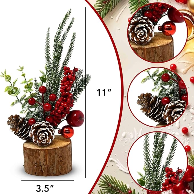 - Complete Set: Includes a mini artificial Christmas tree 11" tall x 3.5" wide; realistic snow covered pine cones, berries, branches & faux stems potted in rustic wood potted base; great for living room tabletop & holiday party Christmas village décor
