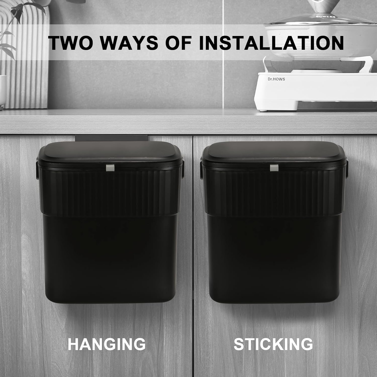 - 2.5 Gallon Wide Application - The 2.5 gallon trash can has a large capacity and fits perfectly in most cabinet doors, pantry doors, and cupboard, not only saving you a lot of space, but also allowing you to throw trash easily without bending down, whether in bathrooms, kitchens, bedrooms, campers, RVs, and other small spaces to add convenience and beauty to your life. (10.5''Lร6''Wร11''H)